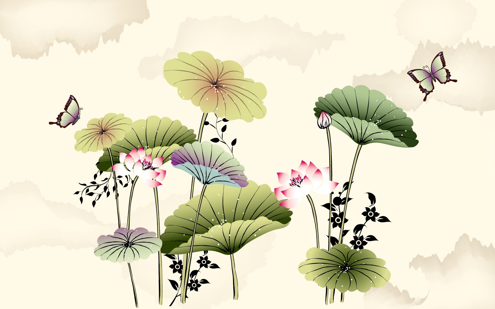 Edytor tapety: Różowe, Kwiaty, Duże, Liście, Motyle