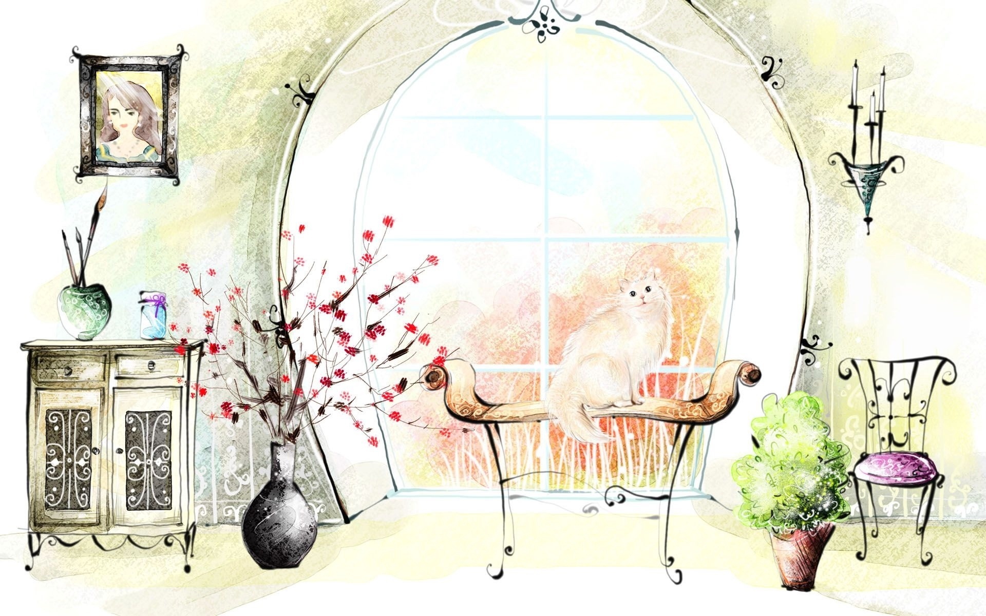 Edytor tapety: Pokój, Kwiaty, Kot, Grafika