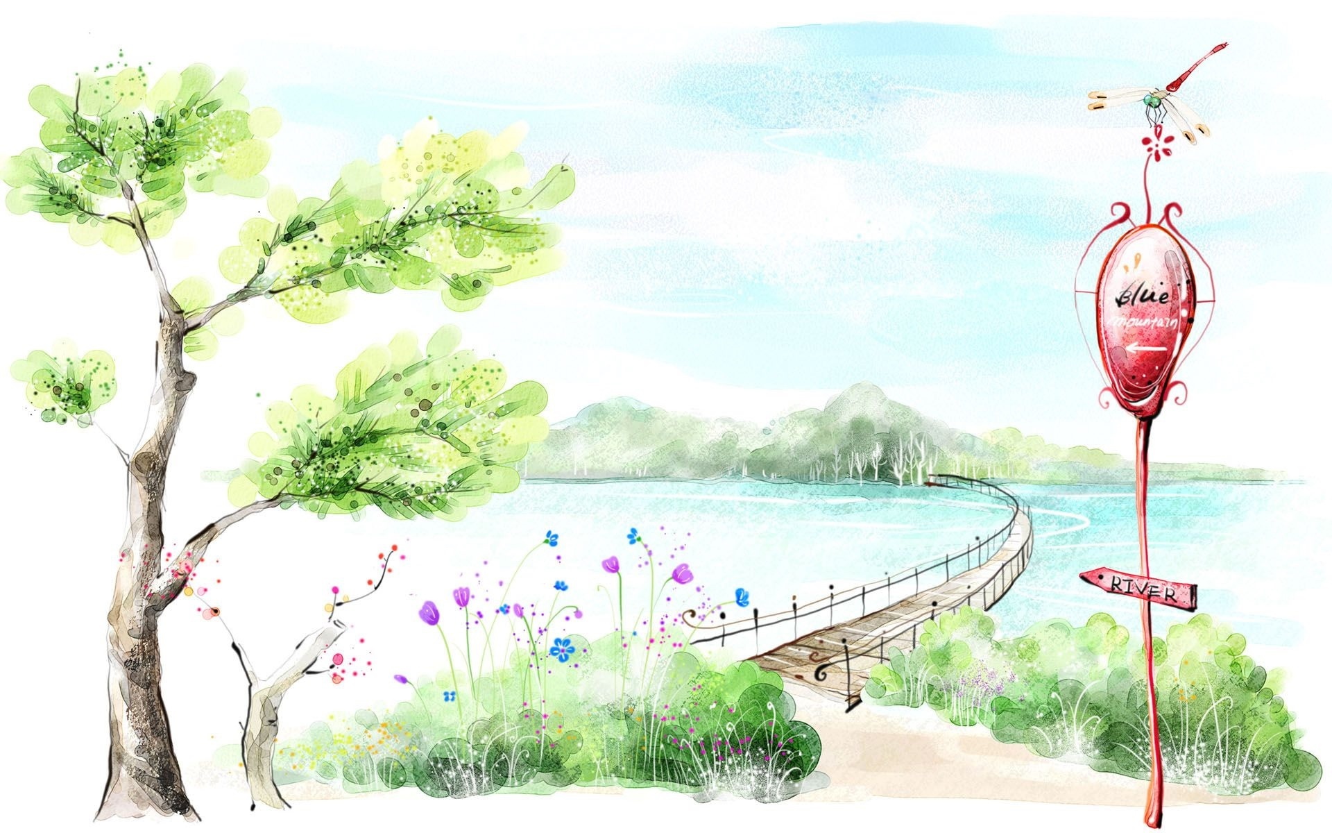 Edytor tapety: Krajobraz, Rzeka, Drzewo, Kwiaty