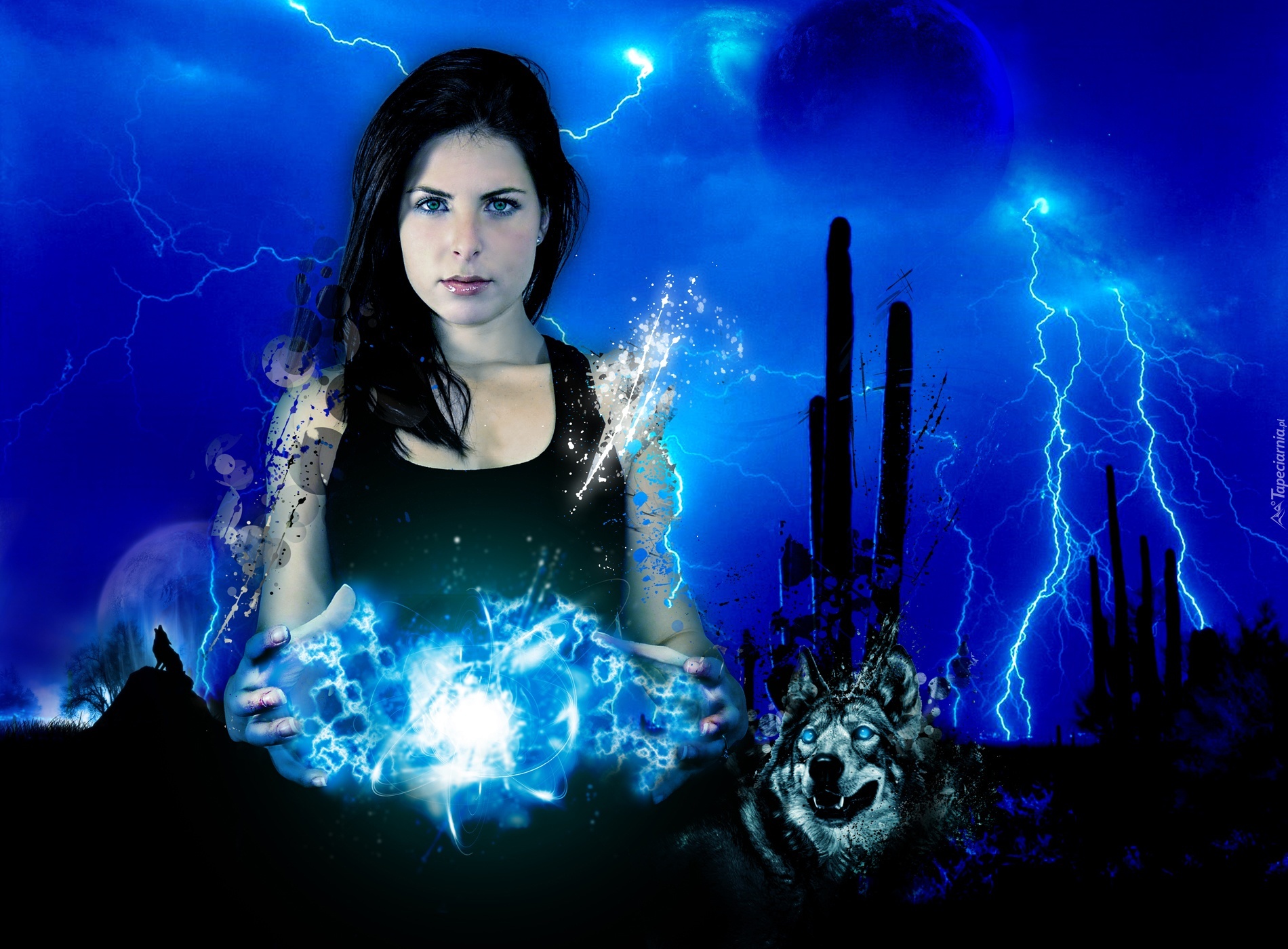 Edytor tapety: Kobieta, Wyładowania, Atmosferyczne, Wilk