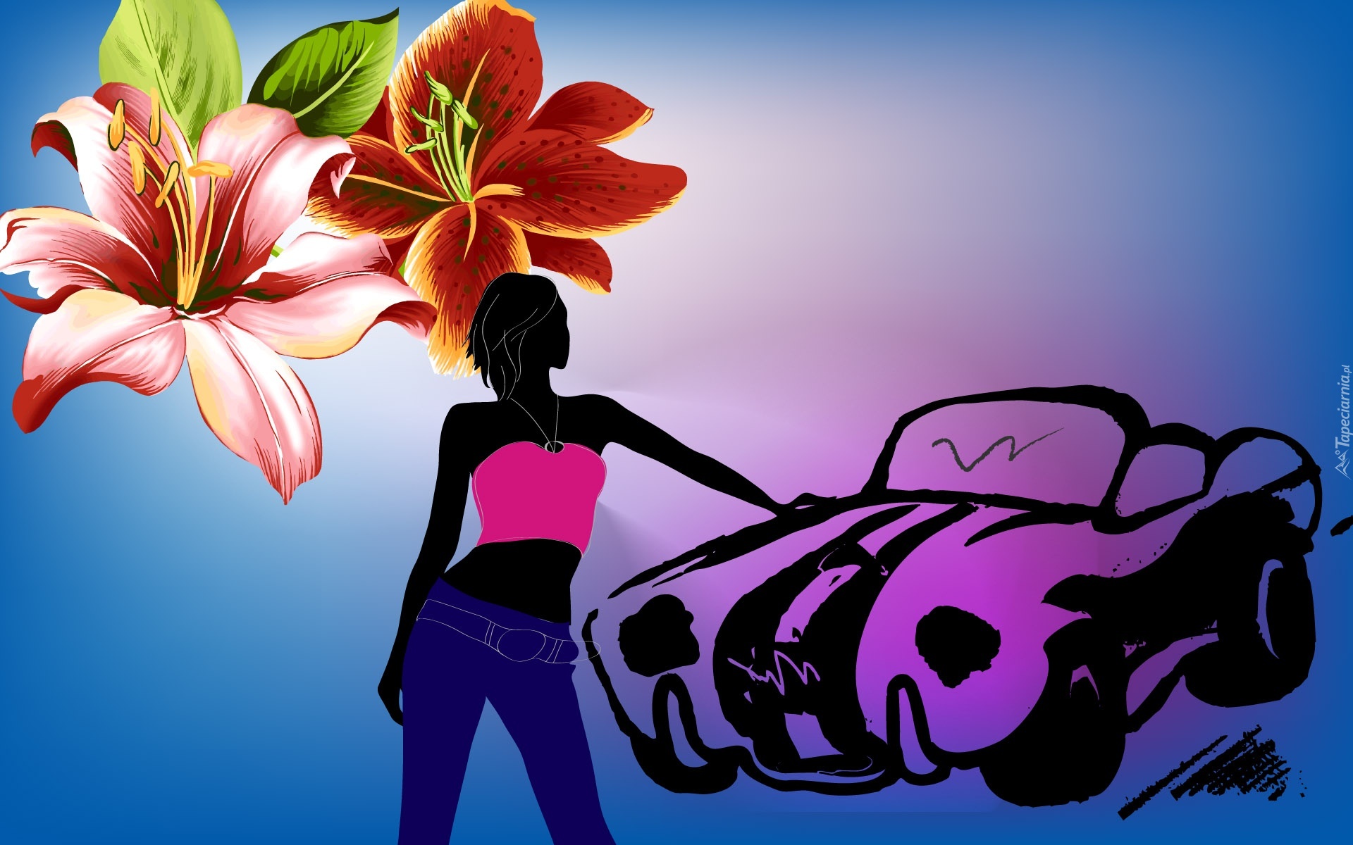 Edytor tapety: Kwiaty, Lilie, Dziewczyna, Samochód, Grafika