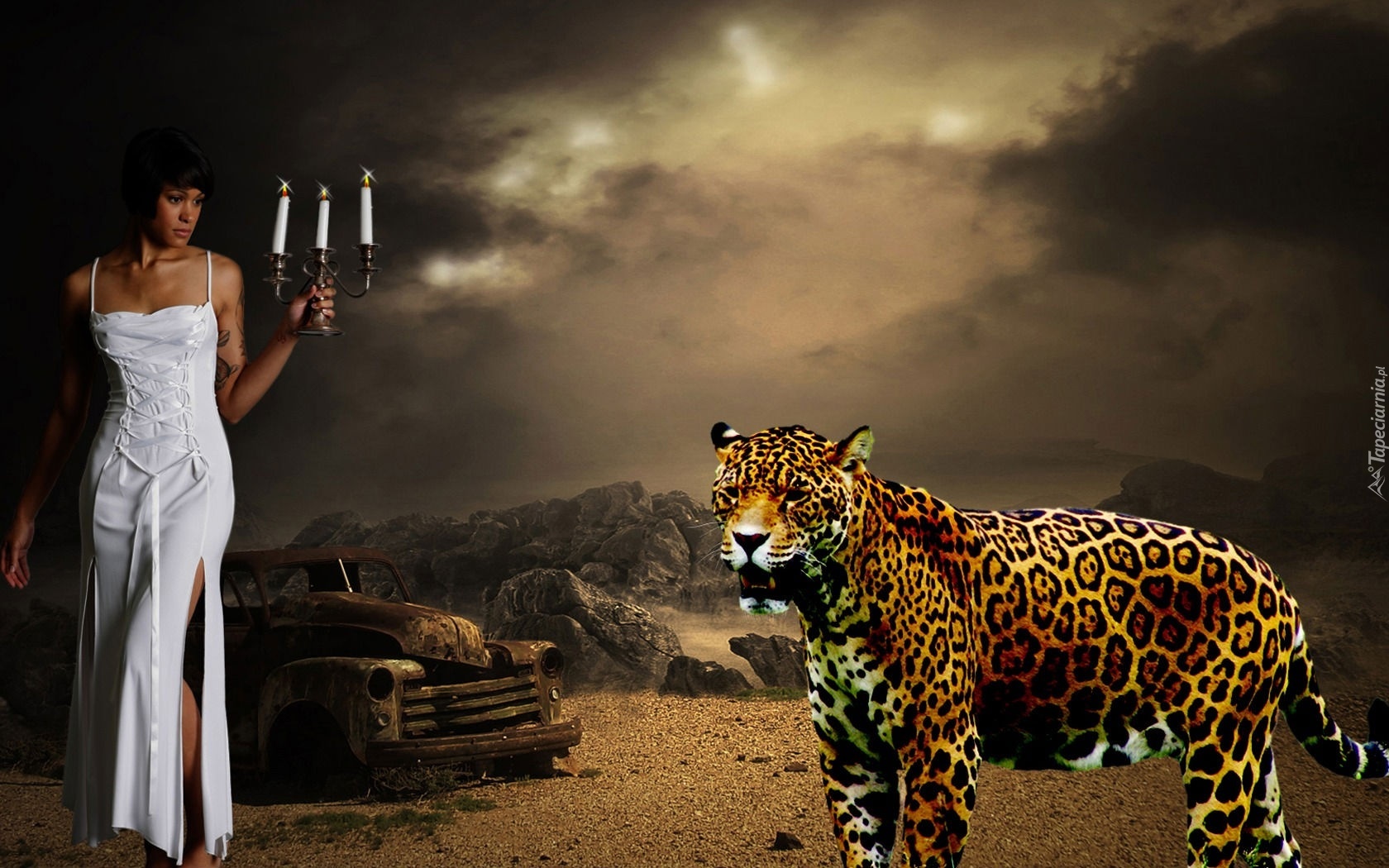 Edytor tapety: Kobieta, Lampart, Skały