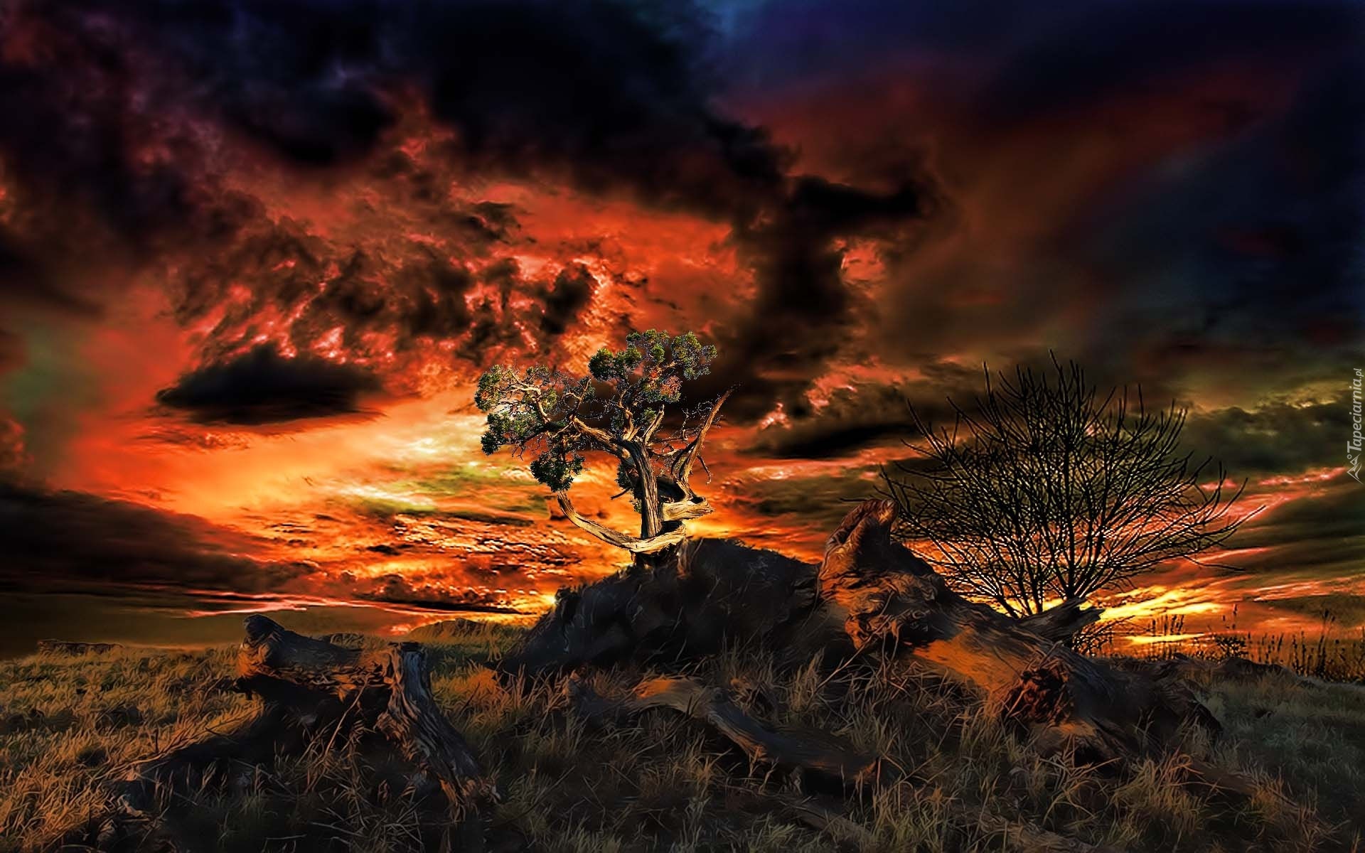 Edytor tapety: Zachód, Słońca, Drzewa, Konary, Trawa