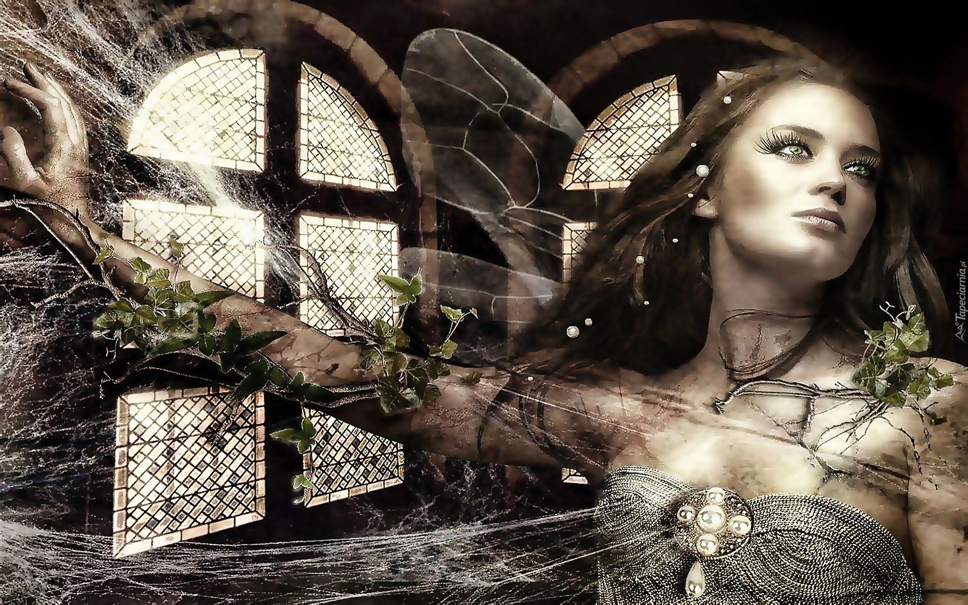 Edytor tapety: Okaleczona, Kobieta, Motyl, Pajęczyna