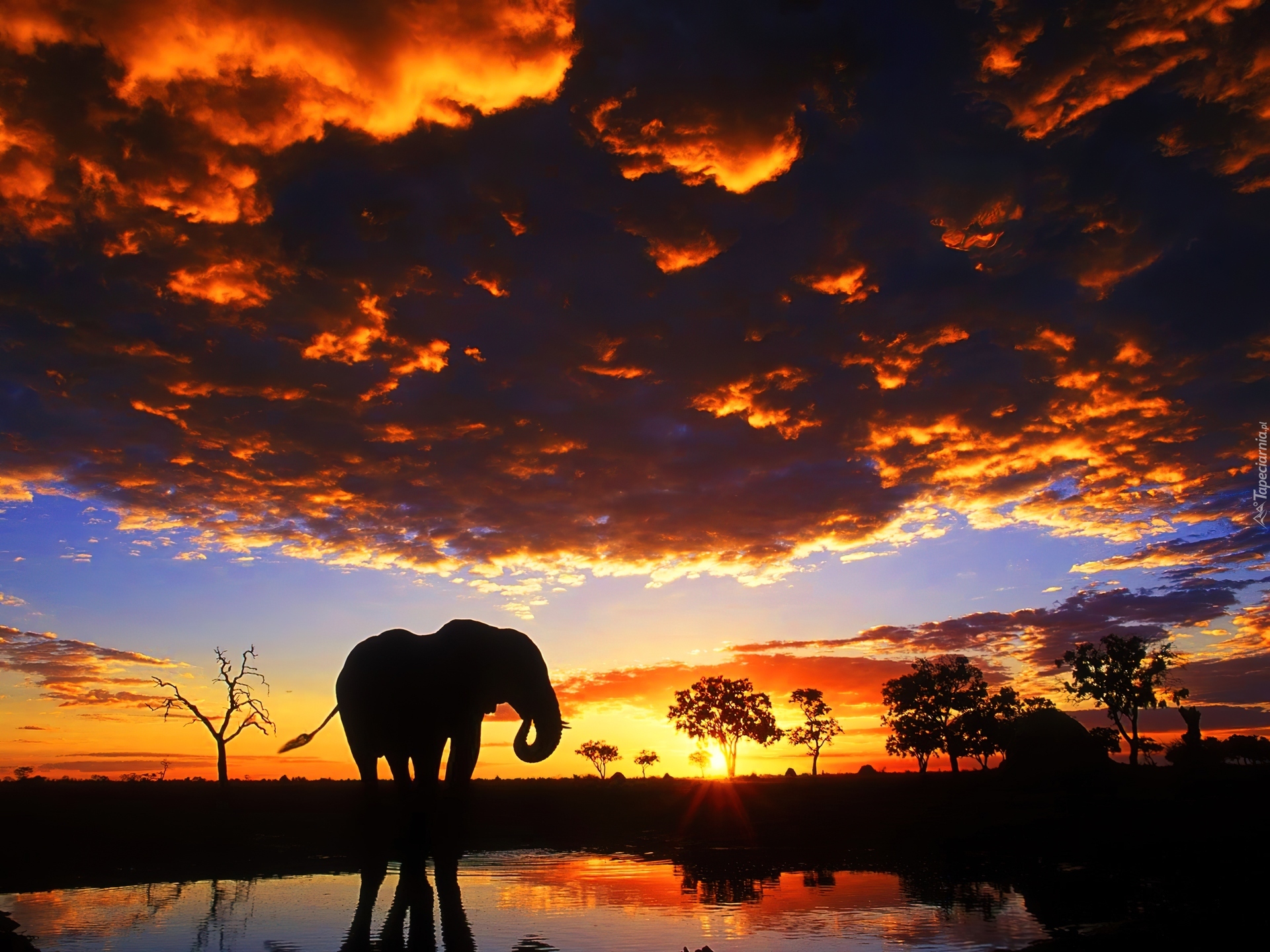 Edytor tapety: Słoń, Wodopój, Zachód, Słońca