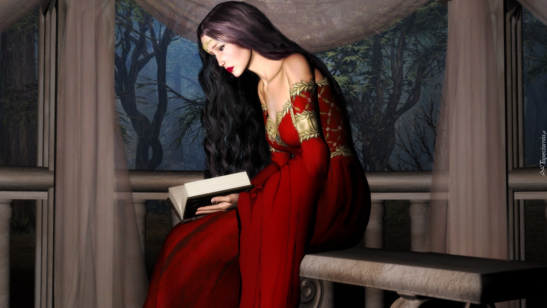 Edytor tapety: Kobieta, Czerwona, Suknia, Książka