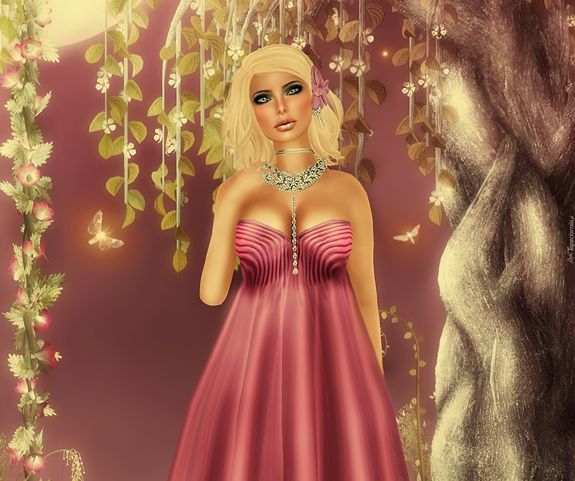 Edytor tapety: Kobieta, Różowa, Sukienka, Drzewo, Grafika