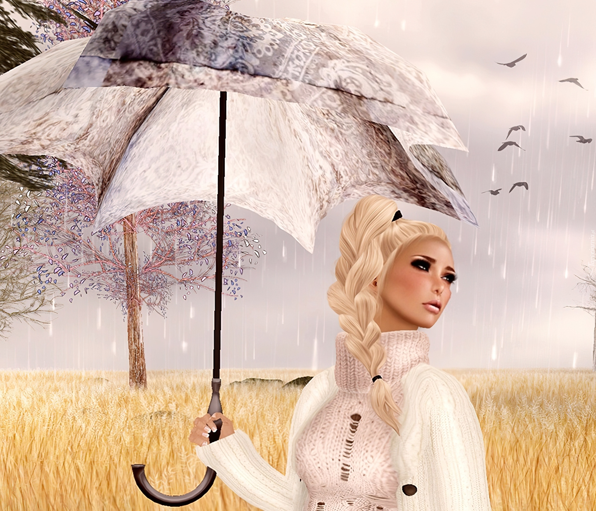 Edytor tapety: Kobieta, Parasol, Deszcz, Grafika 2D