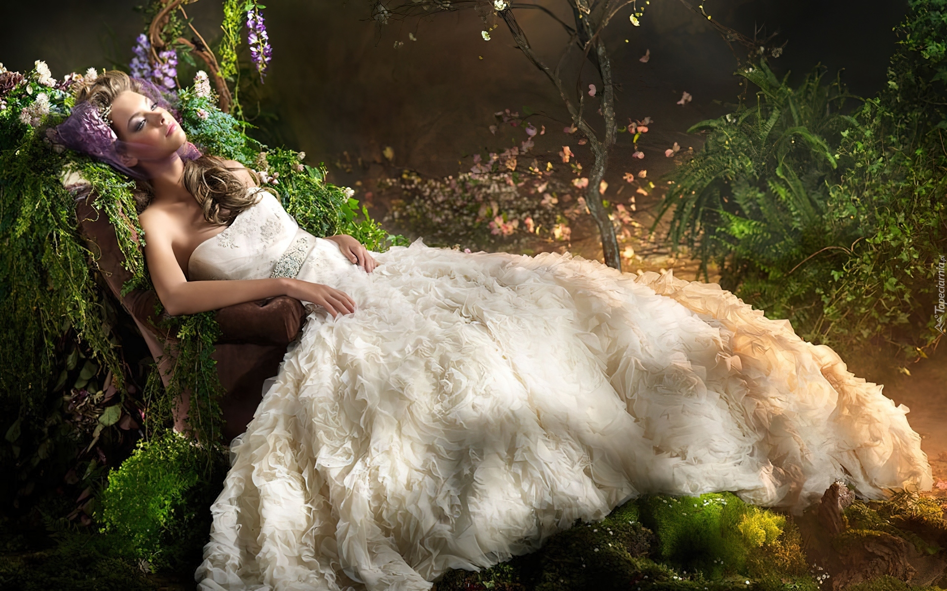 Edytor tapety: Kobieta, Suknia, Pióra, Las