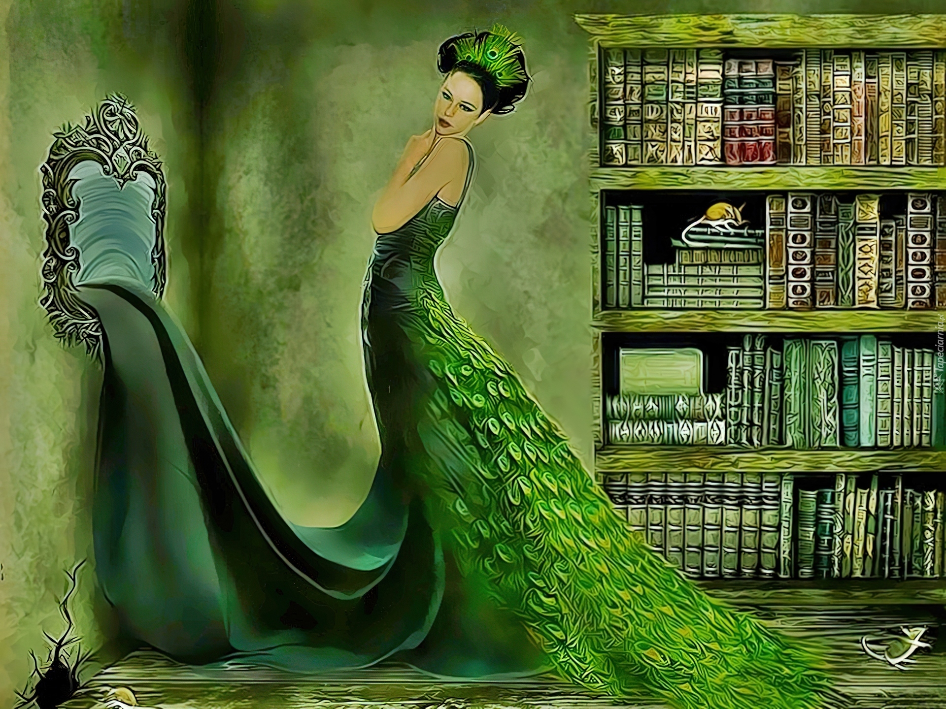 Edytor tapety: Kobieta, Zielona, Suknia, Paw