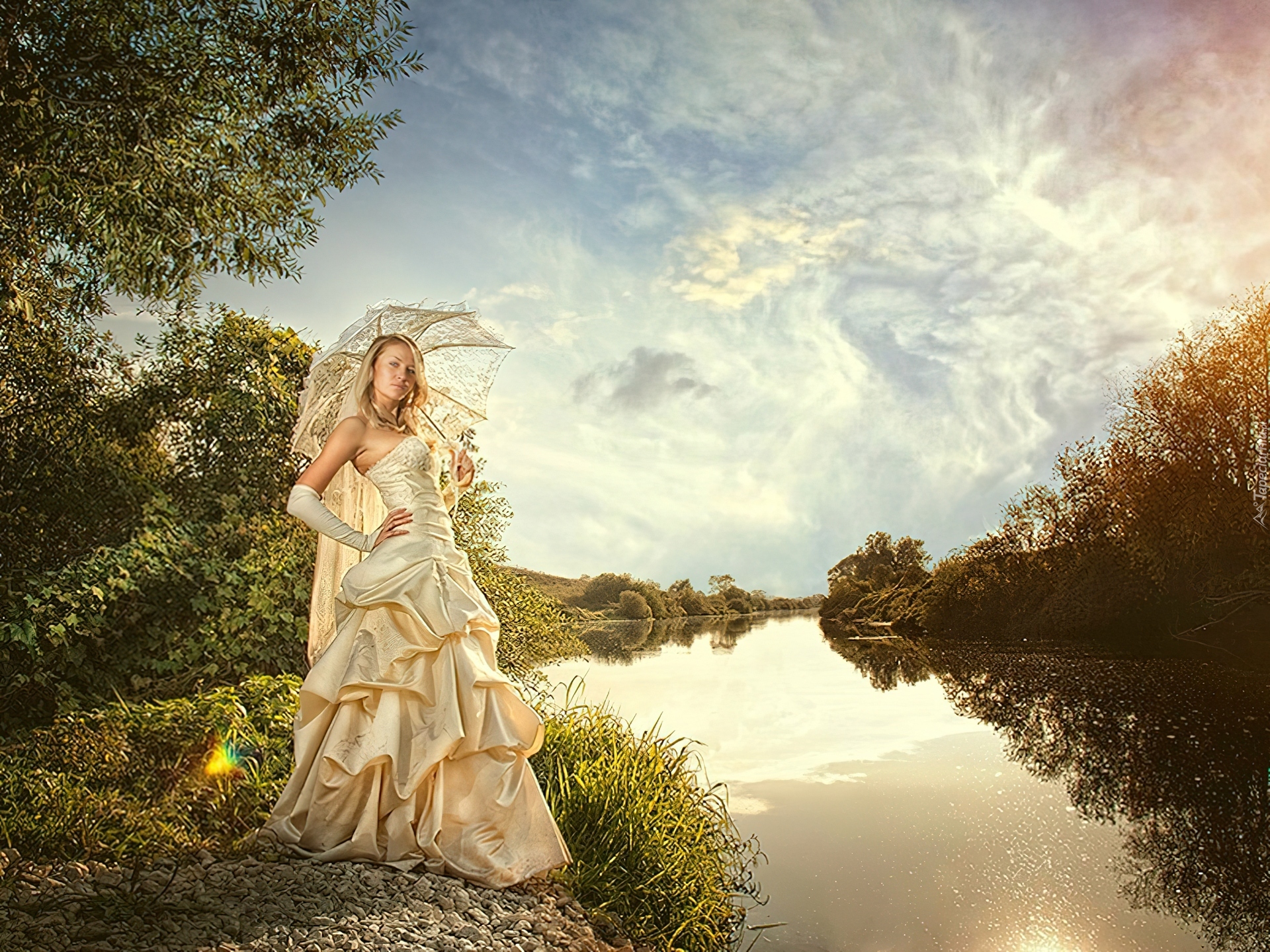 Edytor tapety: Kobieta, Parasol, Rzeka