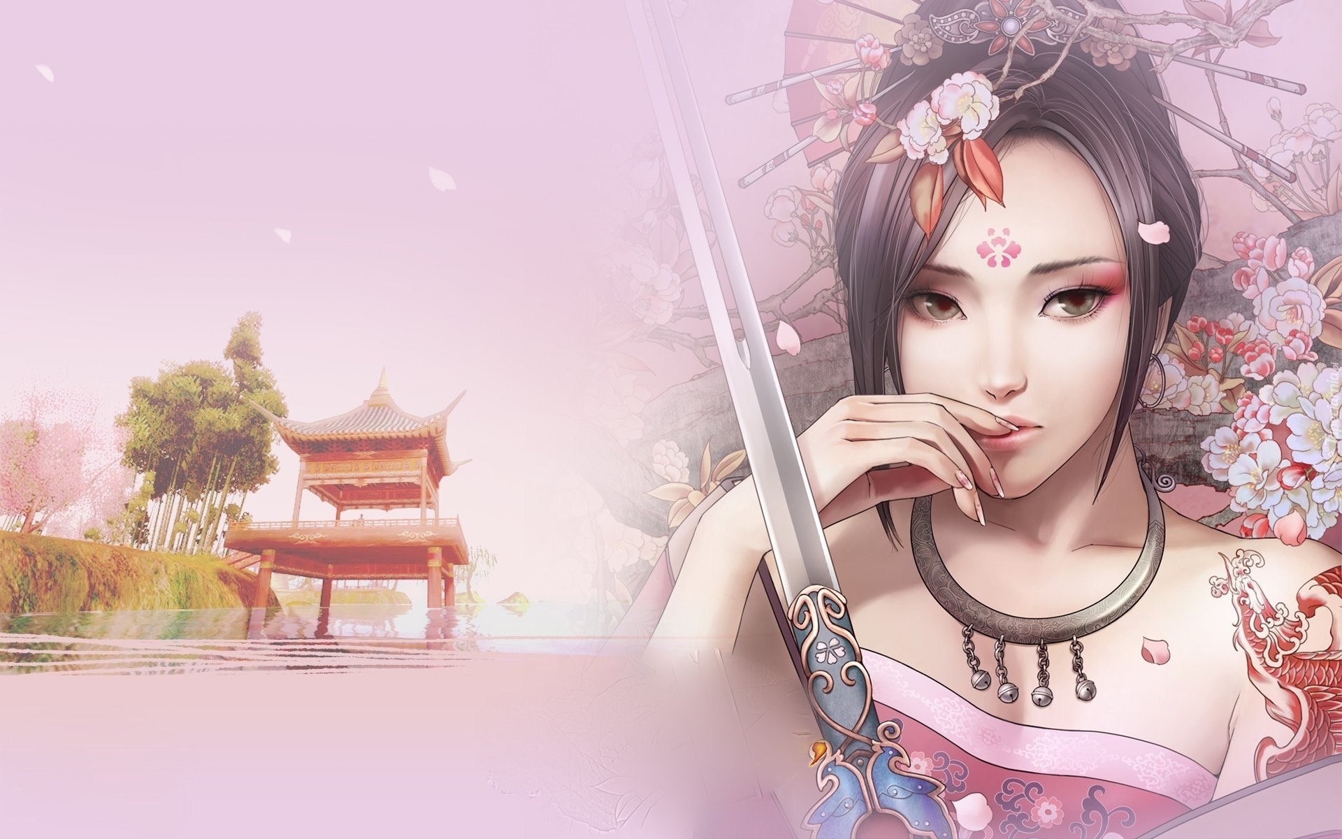 Edytor tapety: Dziewczyna, Szabla, Dom, Drzewo