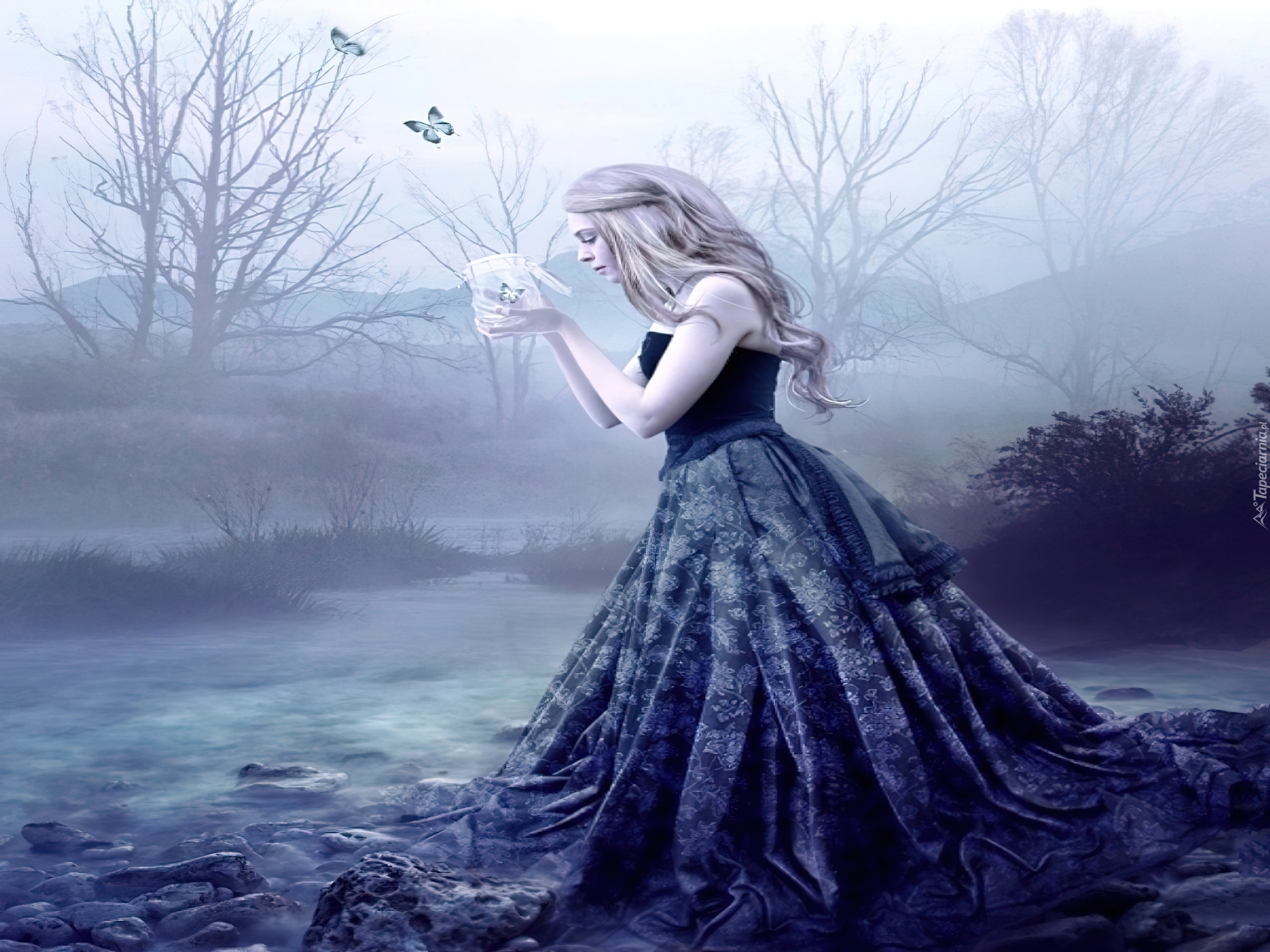 Edytor tapety: Kobieta, Motyle, Woda, Długa, Suknia