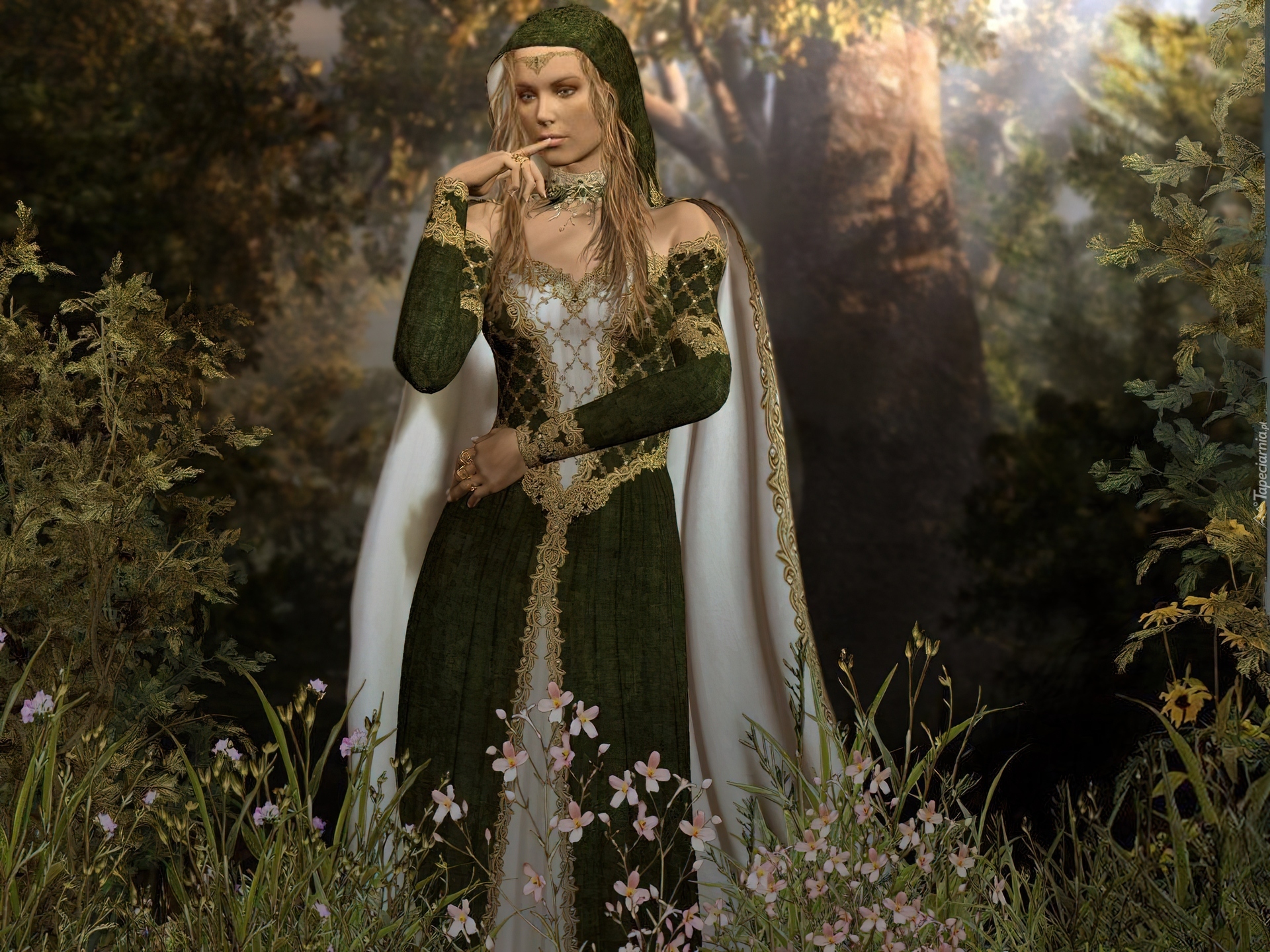 Edytor tapety: Kobieta, Peleryna, Drzewa, Kwiaty
