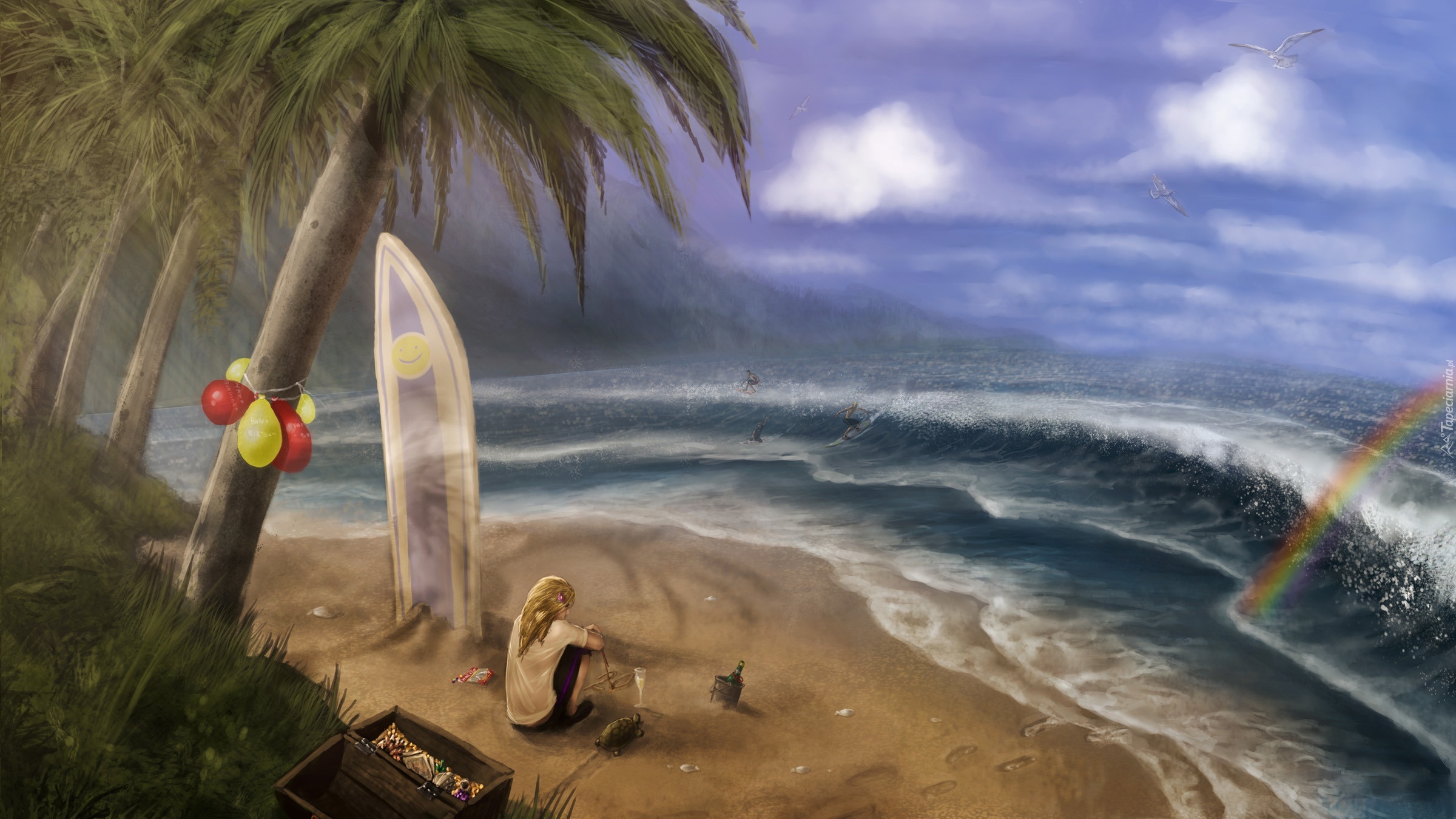 Edytor tapety: Bezludna, Wyspa, Surfer, Tęcza