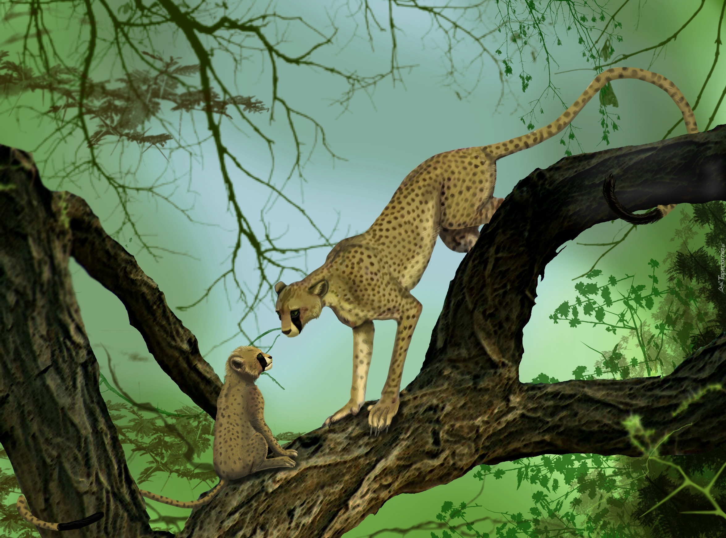 Edytor tapety: Dwa, Gepardy, Drzewo