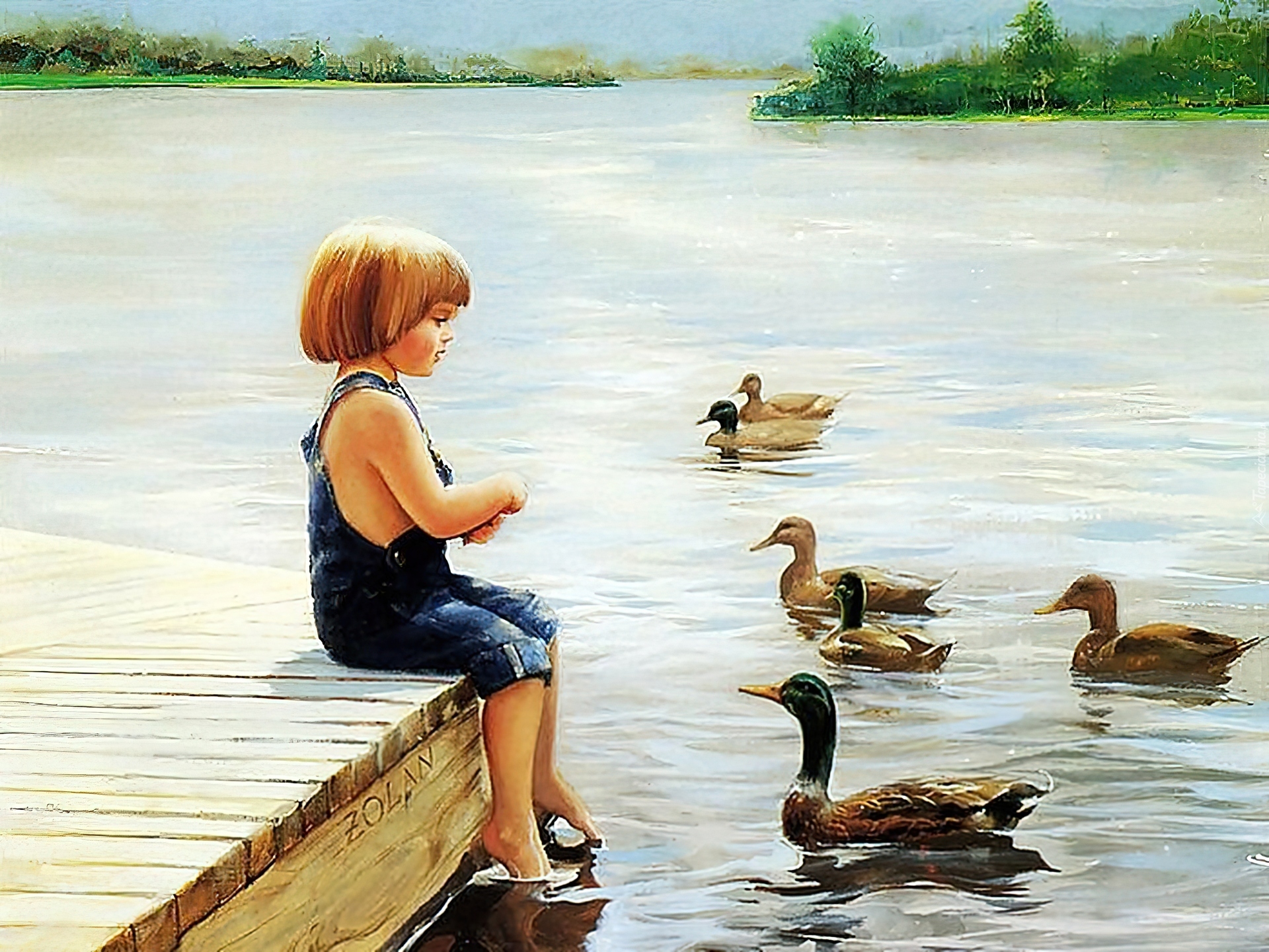 Edytor tapety: Dziewczynka, Pomost, Kaczki