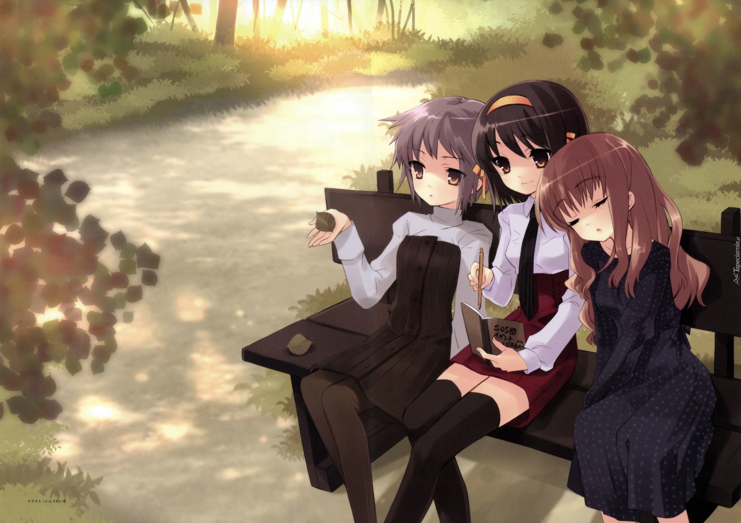 Edytor tapety: Trzy, Dziewczyny, Ławka, Park
