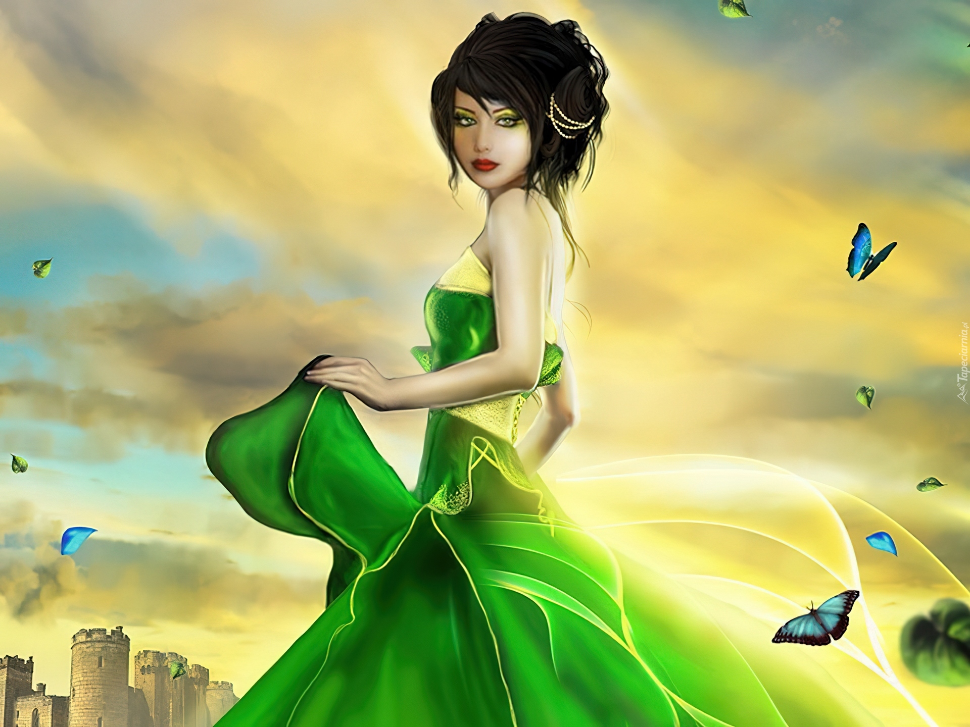 Edytor tapety: Kobieta, Motyle, Zielona, Suknia