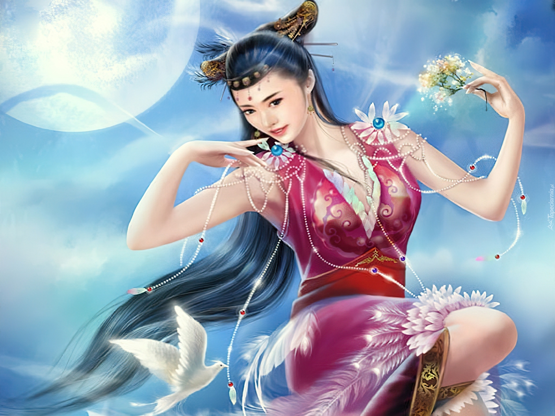 Edytor tapety: Dziewczyna, Koraliki, Kwiaty, Ptak Paintography