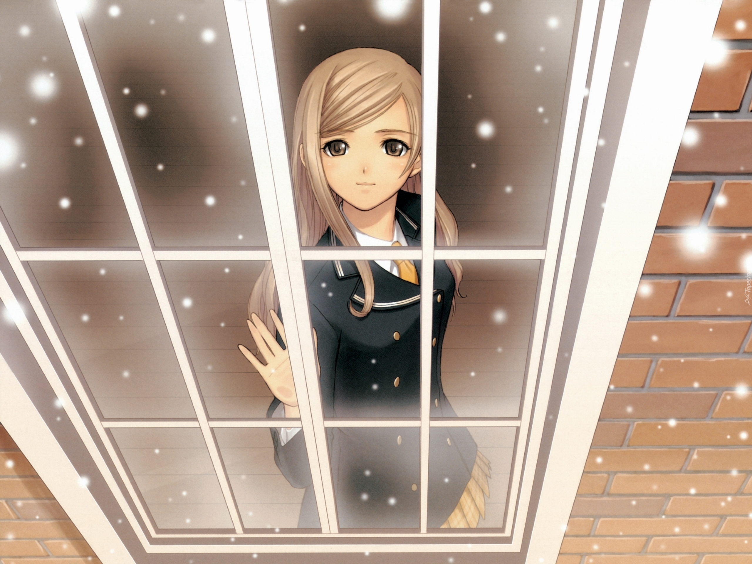 Edytor tapety: Dziewczyna, Okno, Płatki, Śniegu
