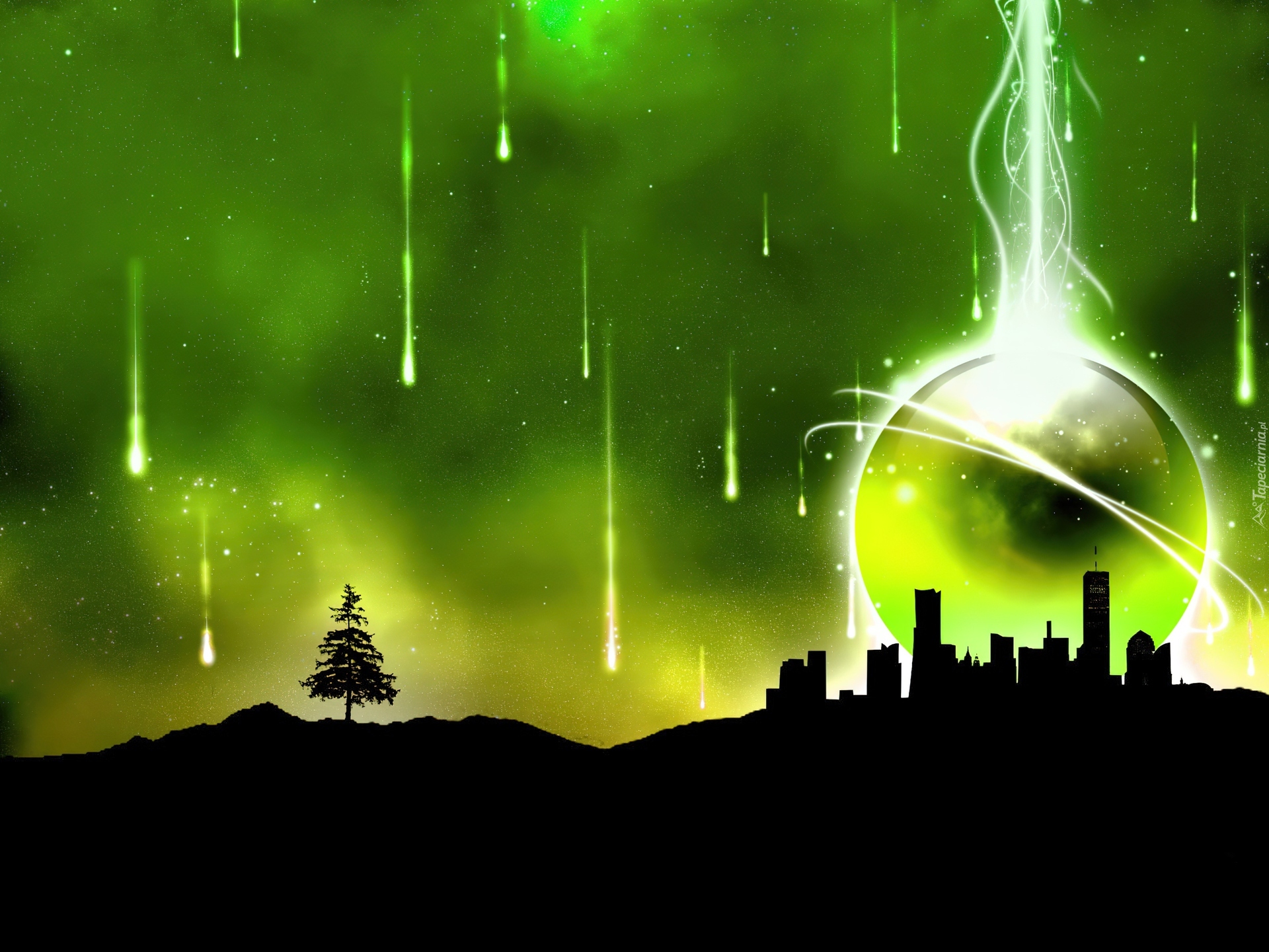 Edytor tapety: Zielony, Krajobraz, Spadające, Gwiazdy