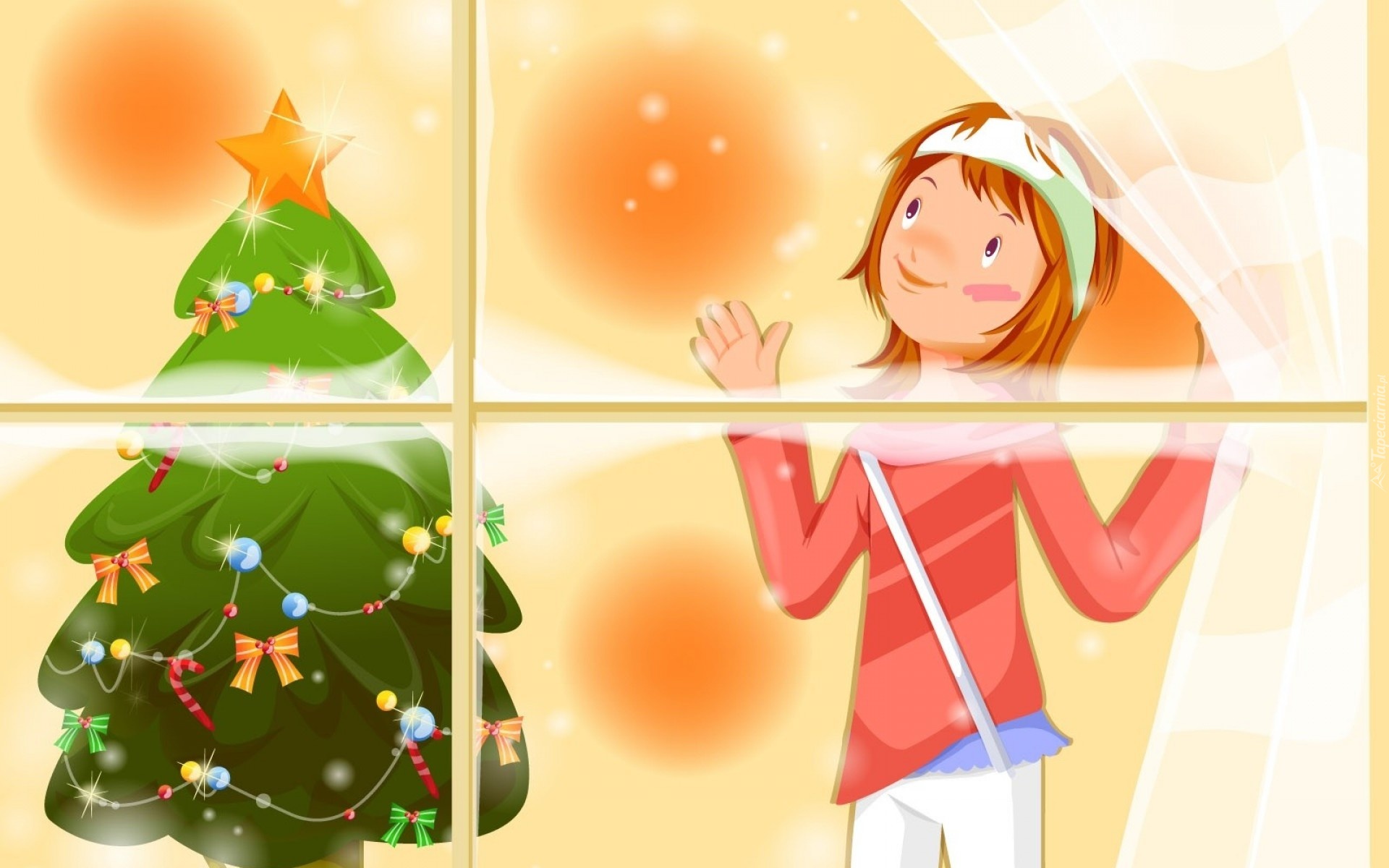 Edytor tapety: Dziewczynka, Choinka, Wyczekiwanie, Święta