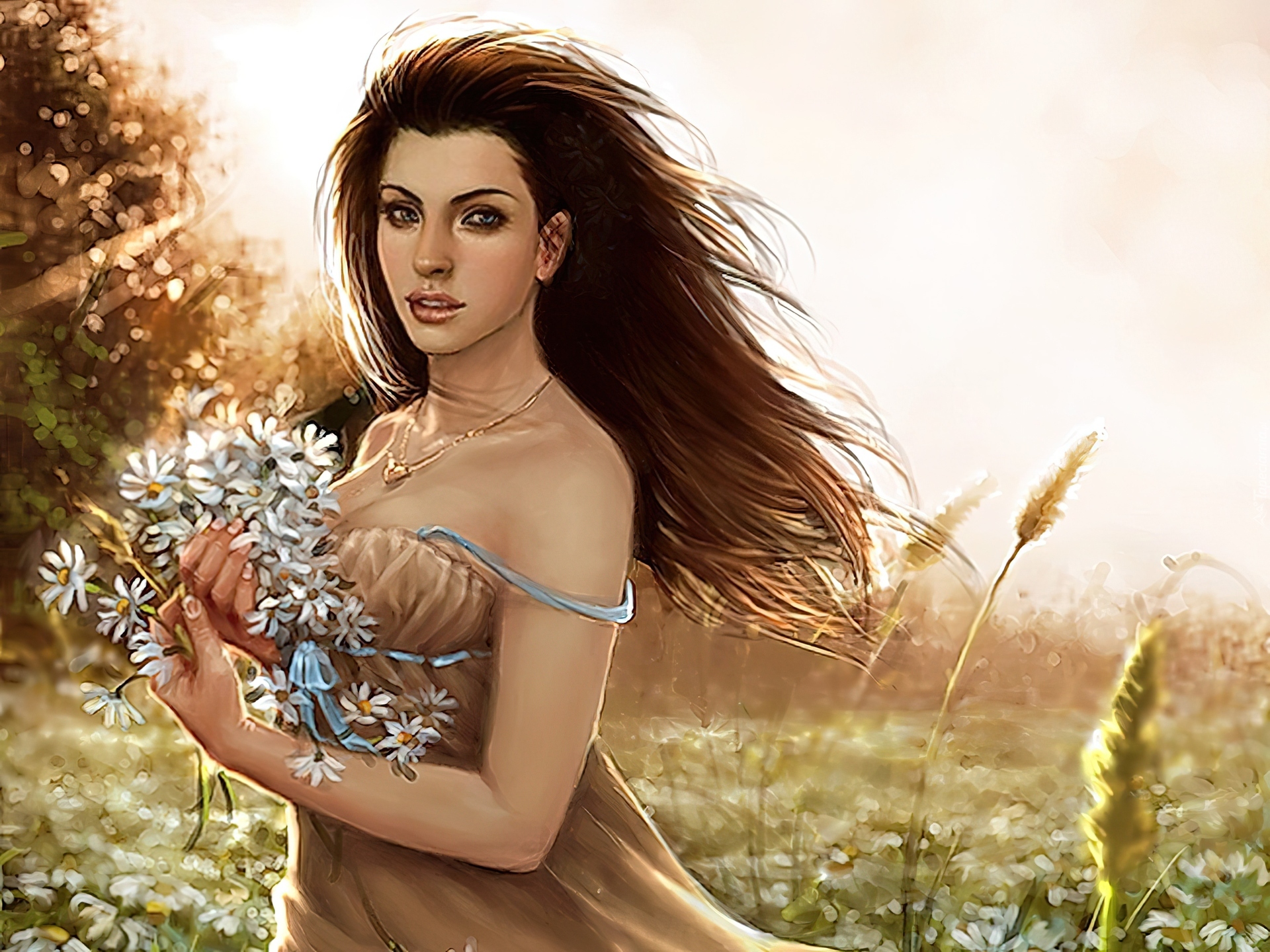 Edytor tapety: Dziewczyna, Naszyjnik, Kwiaty, Łąka