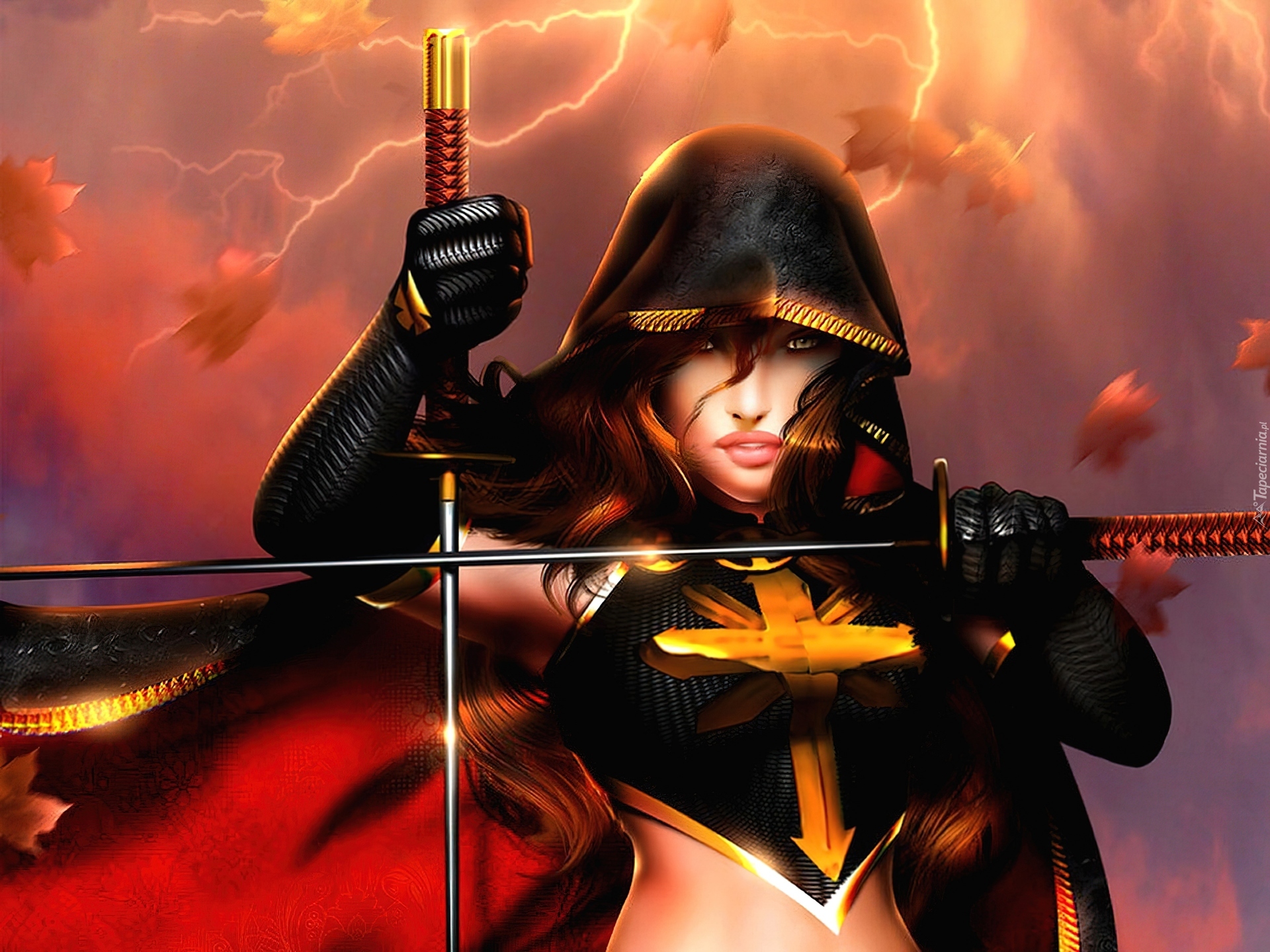 Edytor tapety: Dziewczyna, Kaptur, Dwa, Miecze, Liście