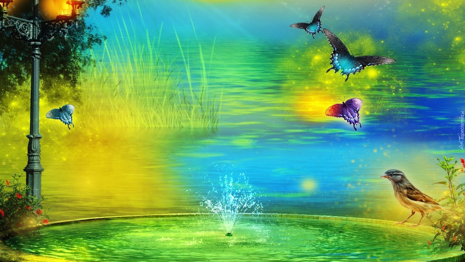 Edytor tapety: Fontanna, Woda, Motyle, Ptak
