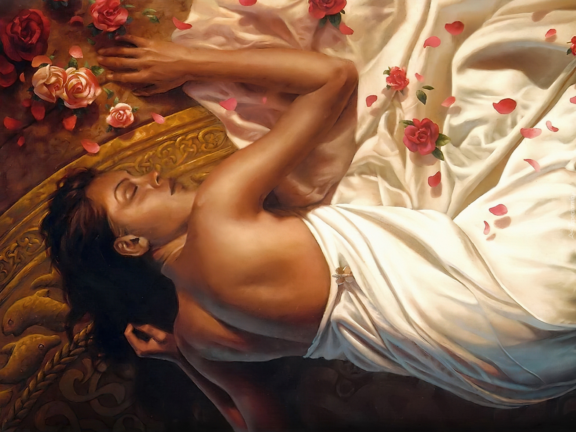 Edytor tapety: Śpiąca, Kobieta, Prześcieradło, Róże