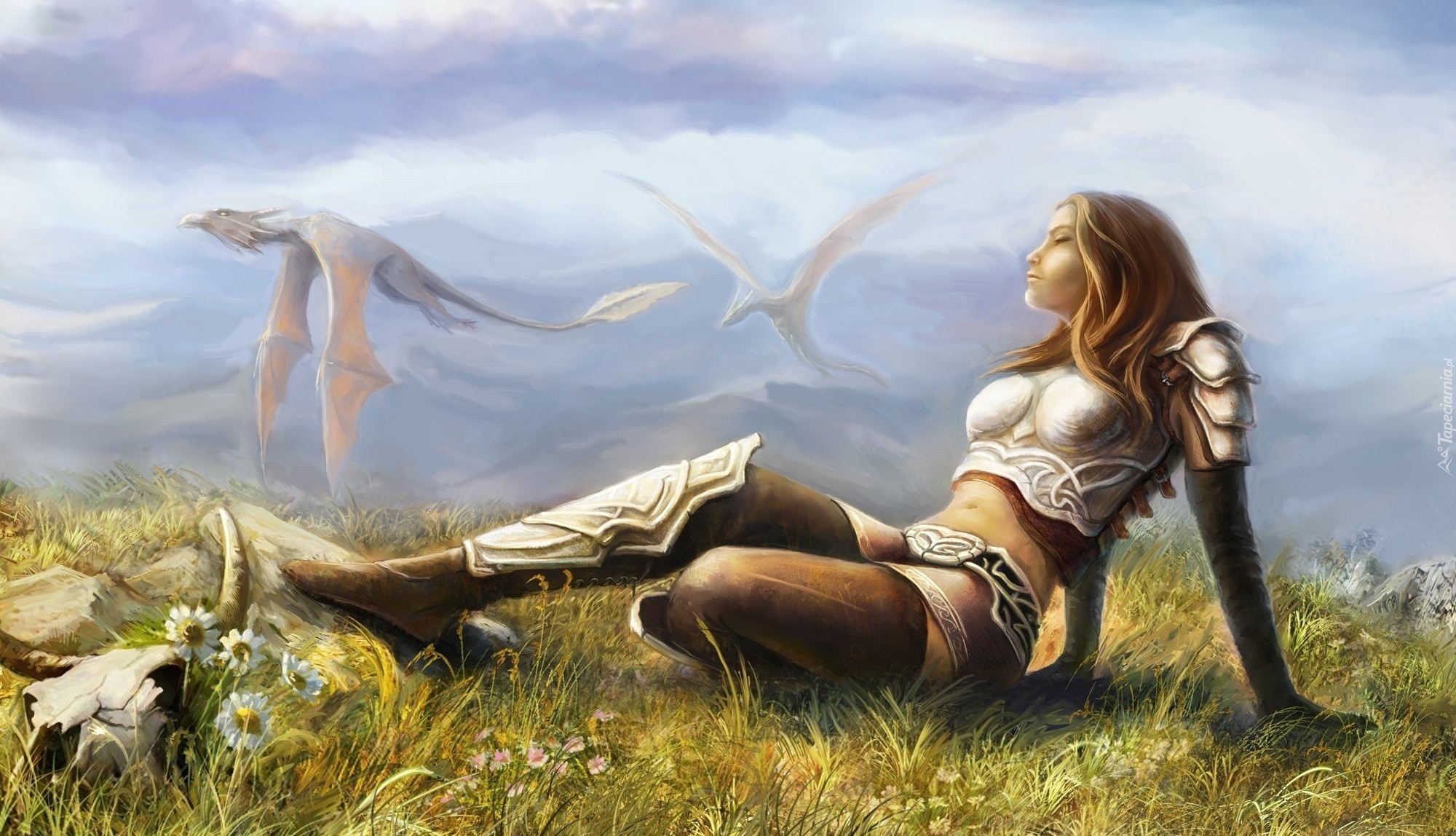 Edytor tapety: Dziewczyna, Zbroja, Trawa, Kamienie