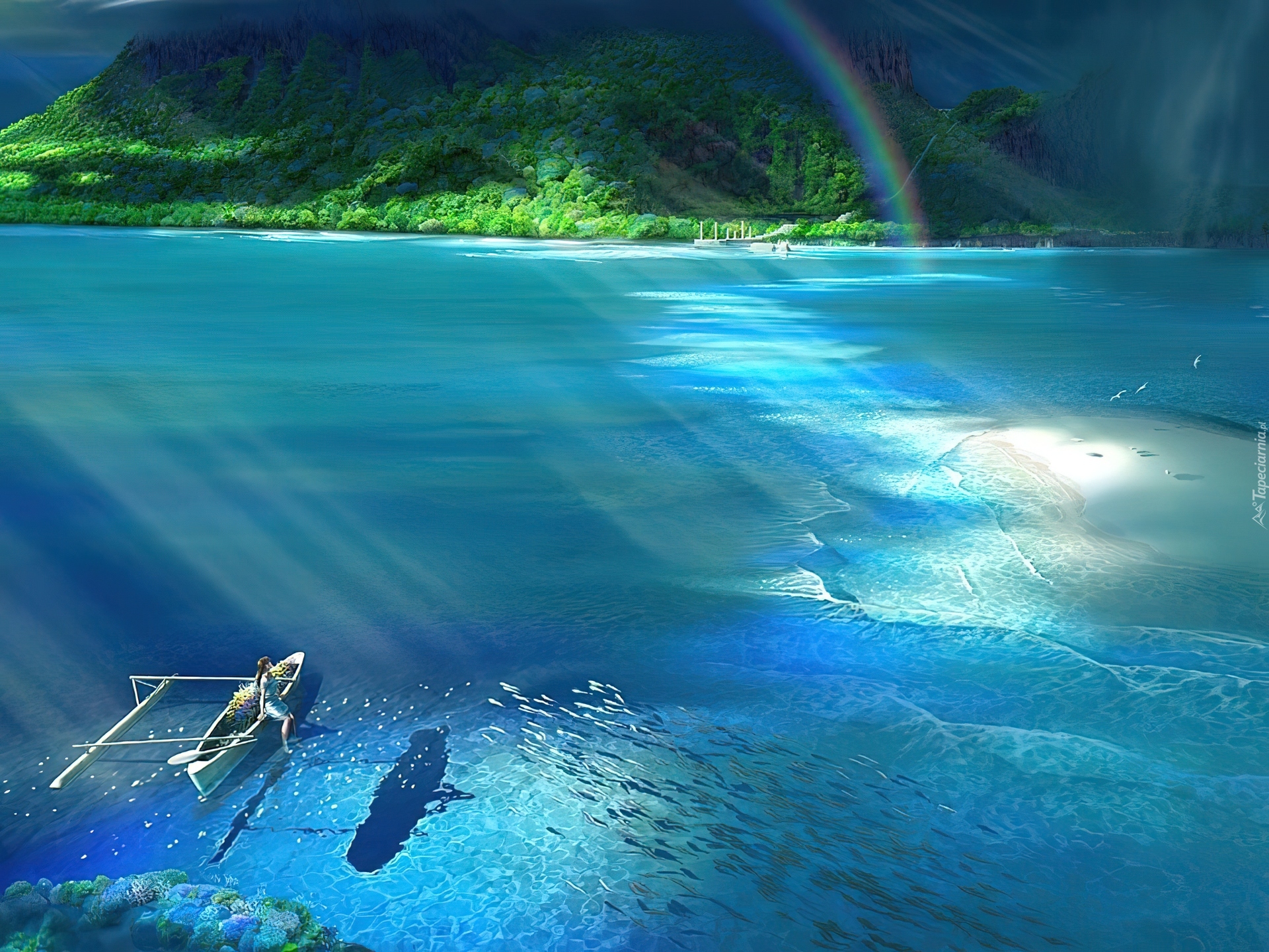 Edytor tapety: Tęcza, Woda, Ptaki, Łajba