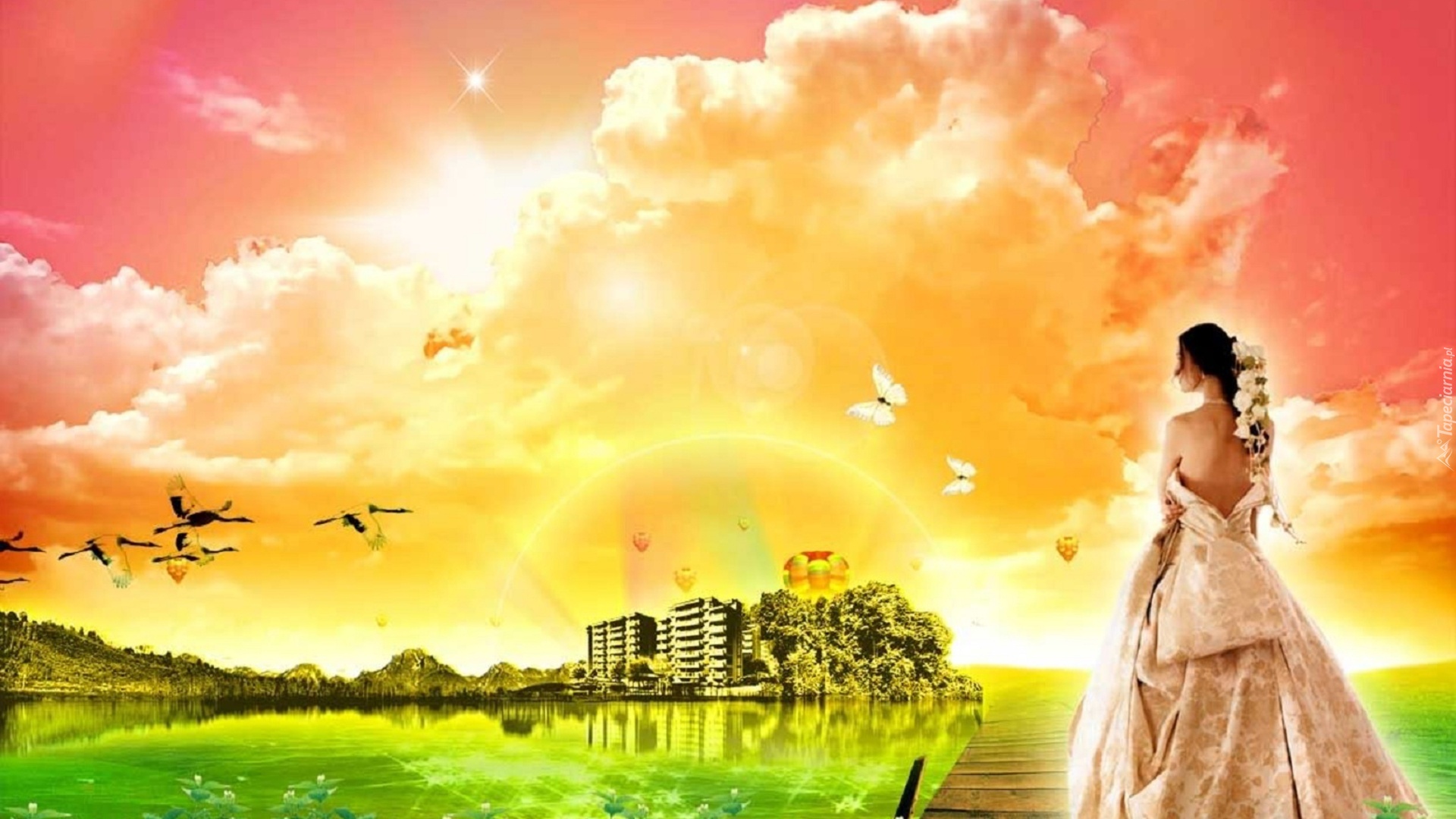 Edytor tapety: Kobieta, Woda, Motyle, Ptaki
