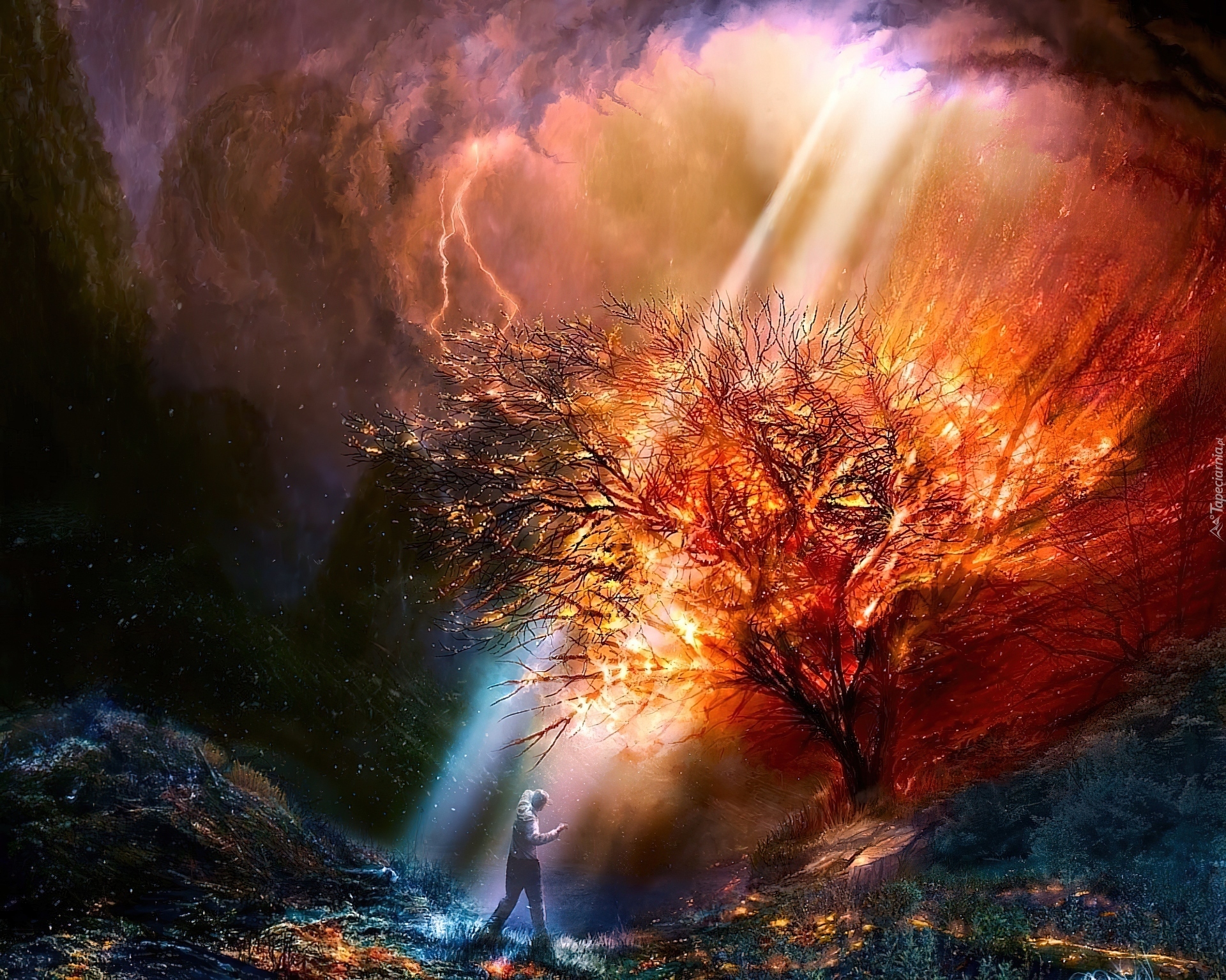 Edytor tapety: Burza, Płonące, Drzewo, Mężczyzna
