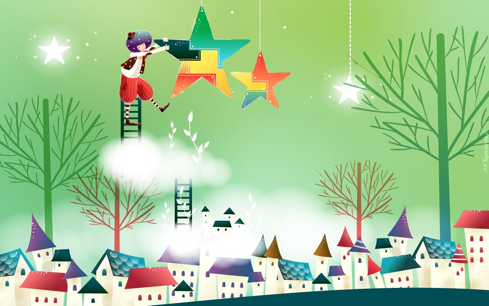 Edytor tapety: Pajacyk, Drabiny, Gwiazdy, Miasteczko, Fantasy