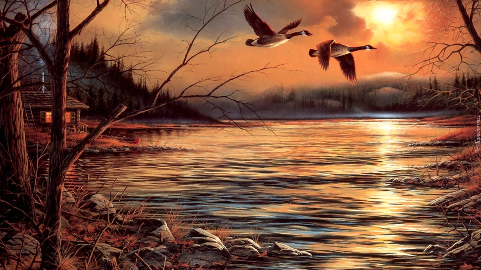 Edytor tapety: Zachód, Słońca, Gęsi, Kanadyjskie, Woda, Terry Avon Redlin