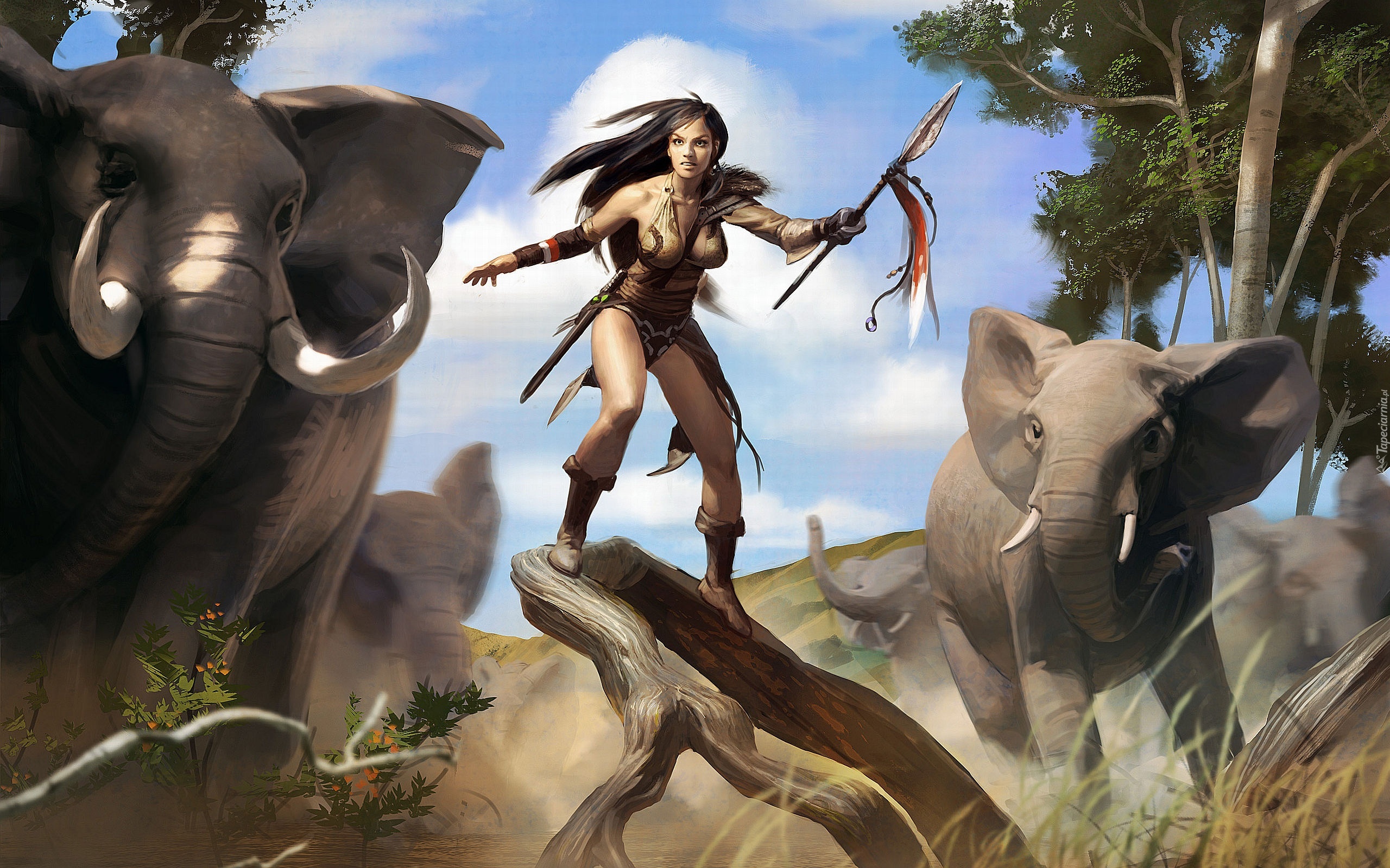 Edytor tapety: Wojowniczka, Słonie, Drzewa