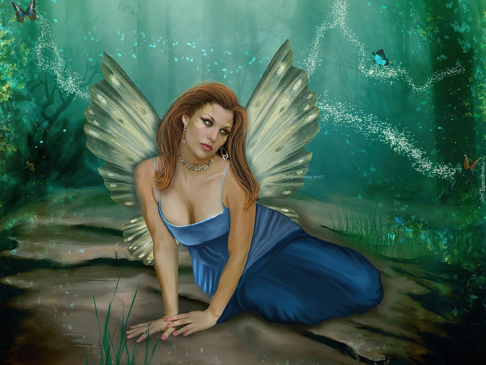 Edytor tapety: Dziewczyna, Skrzydła, Niebieska, Suknia, Motylek