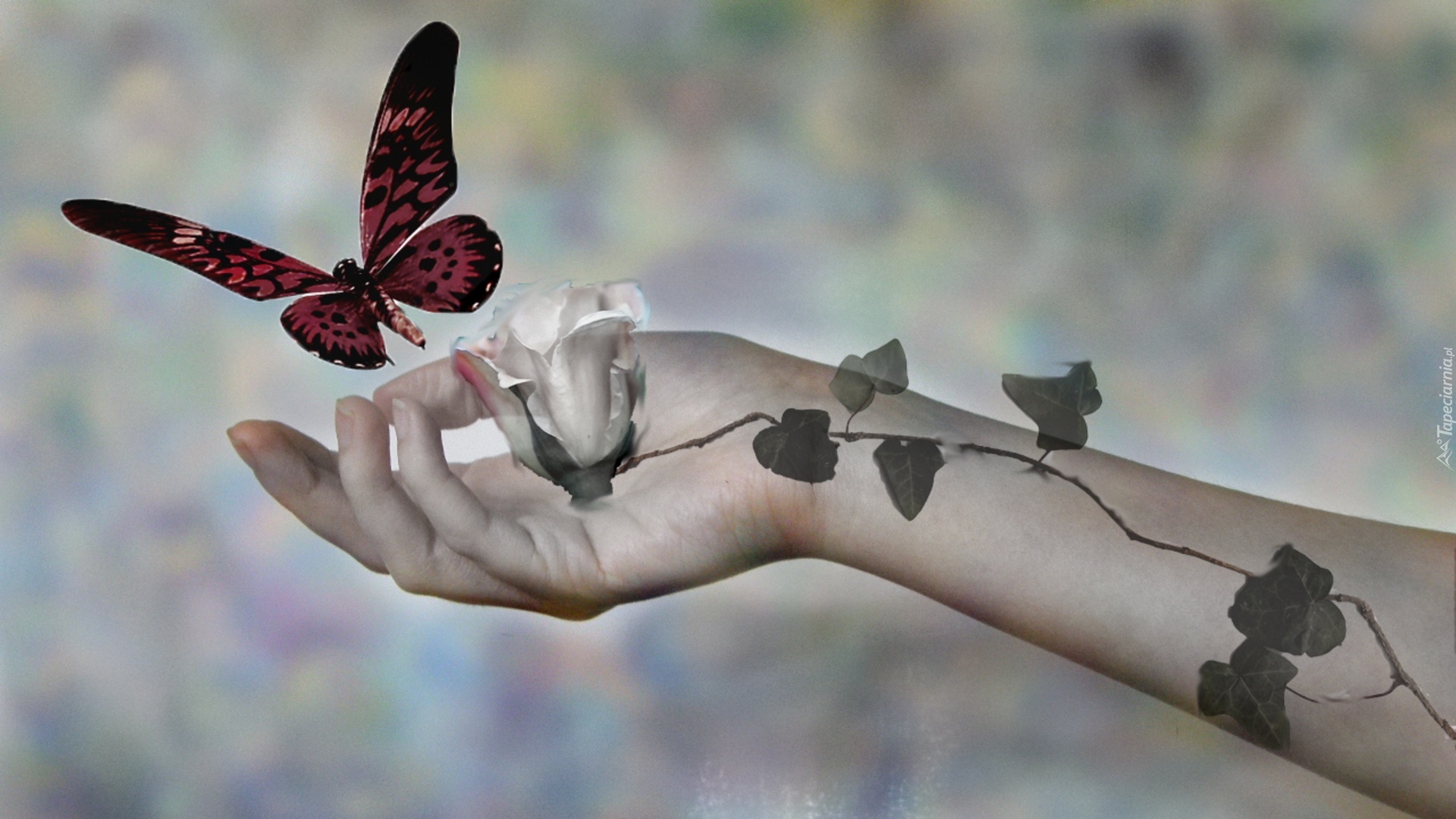 Edytor tapety: Biała, Róża, Bluszcz, Ręka, Motyl
