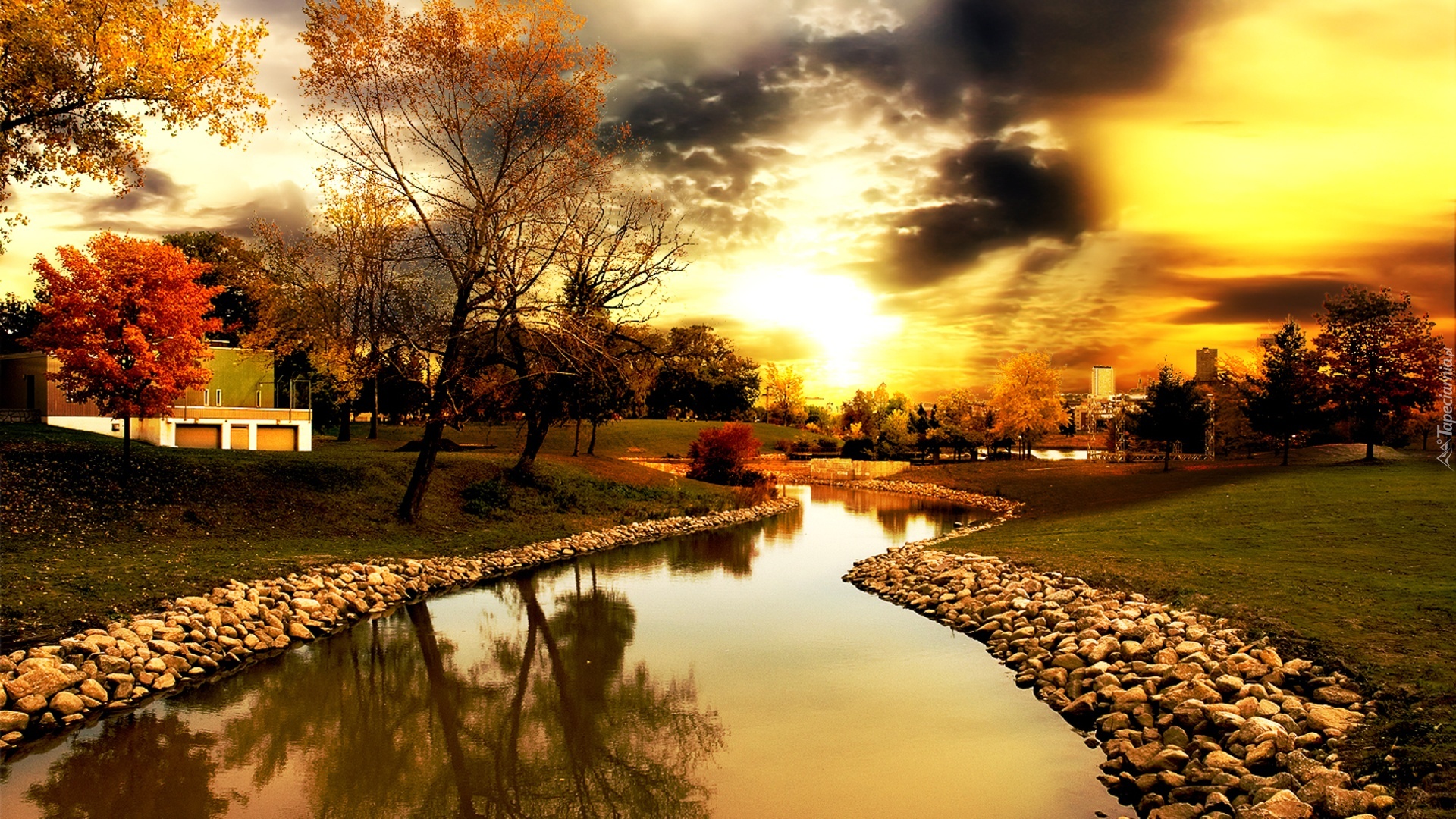 Edytor tapety: Zachód, Słońca, Rzeczka, Brzegi, Kamienie