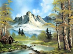 Edytor tapety: Krajobraz, Rzeka, Chatka, Góry, Bob Ross