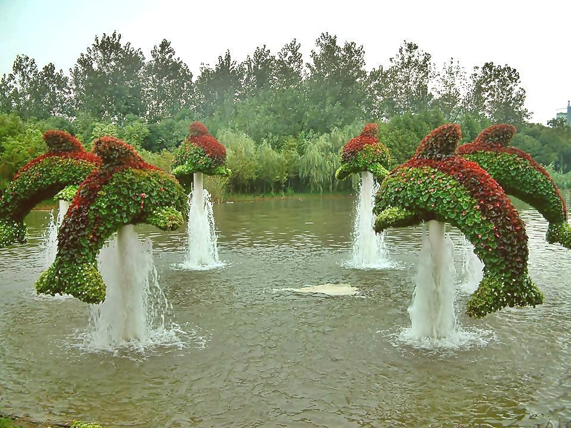 Edytor tapety: Ogród, Fontanny, Delfiny, Krzewy