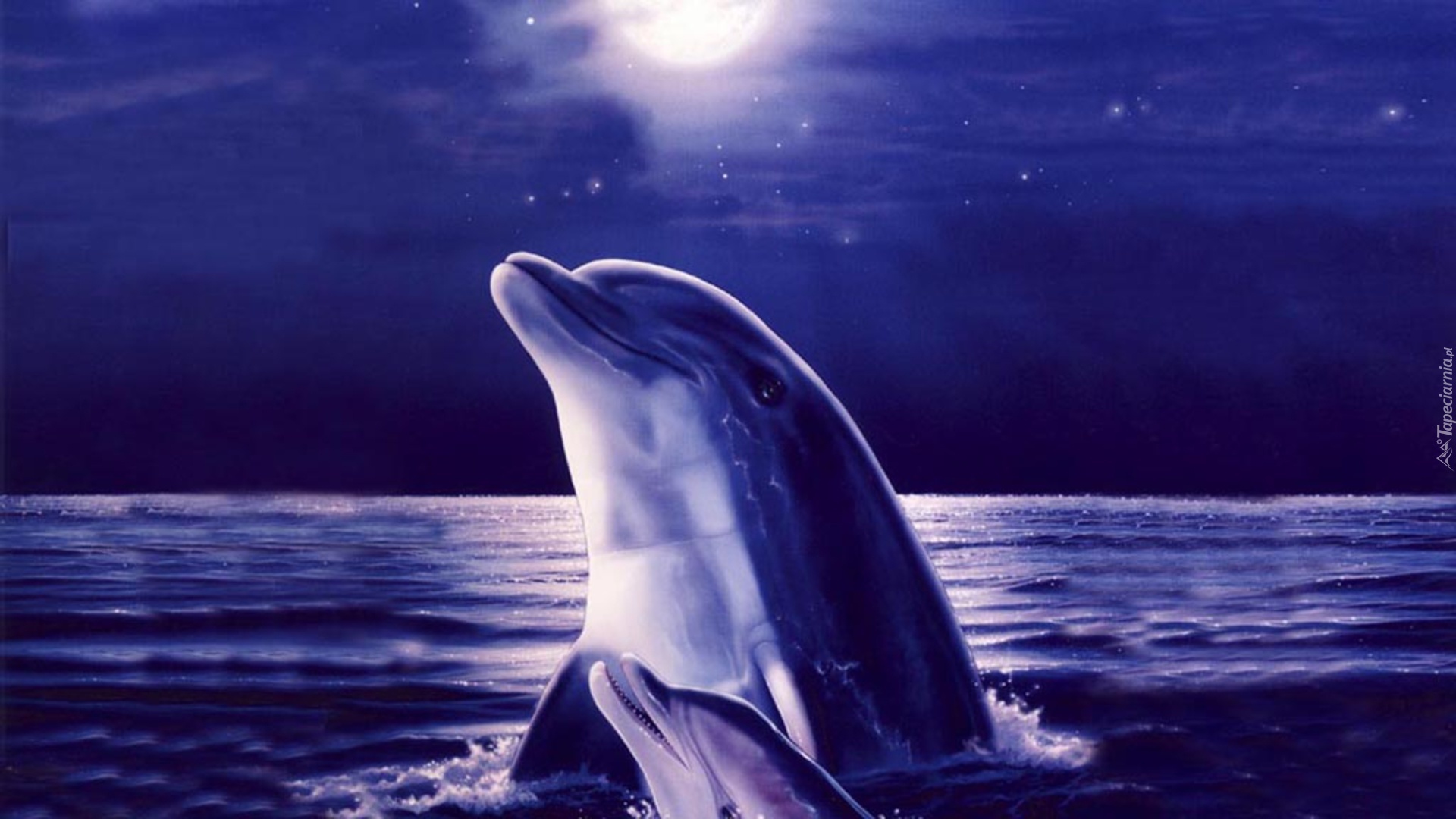 Edytor tapety: Dwa, Delfiny, Woda, Księżyc