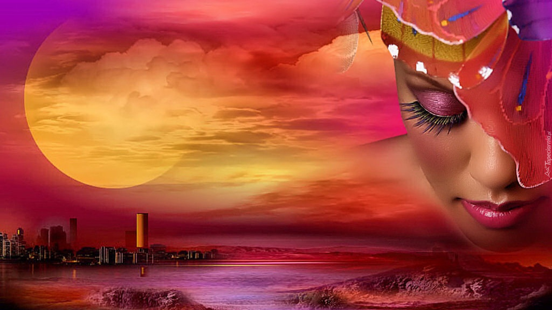 Edytor tapety: Kobieta, Makijaż, Zachód, Słońca, Woda