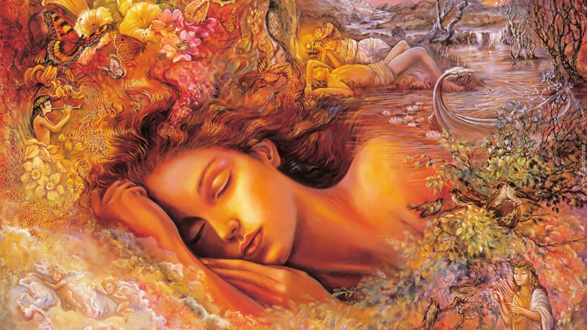 Edytor tapety: Śpiąca, Dziewczyna, Woda, Kwiaty, Drzewa, Josephine Wall