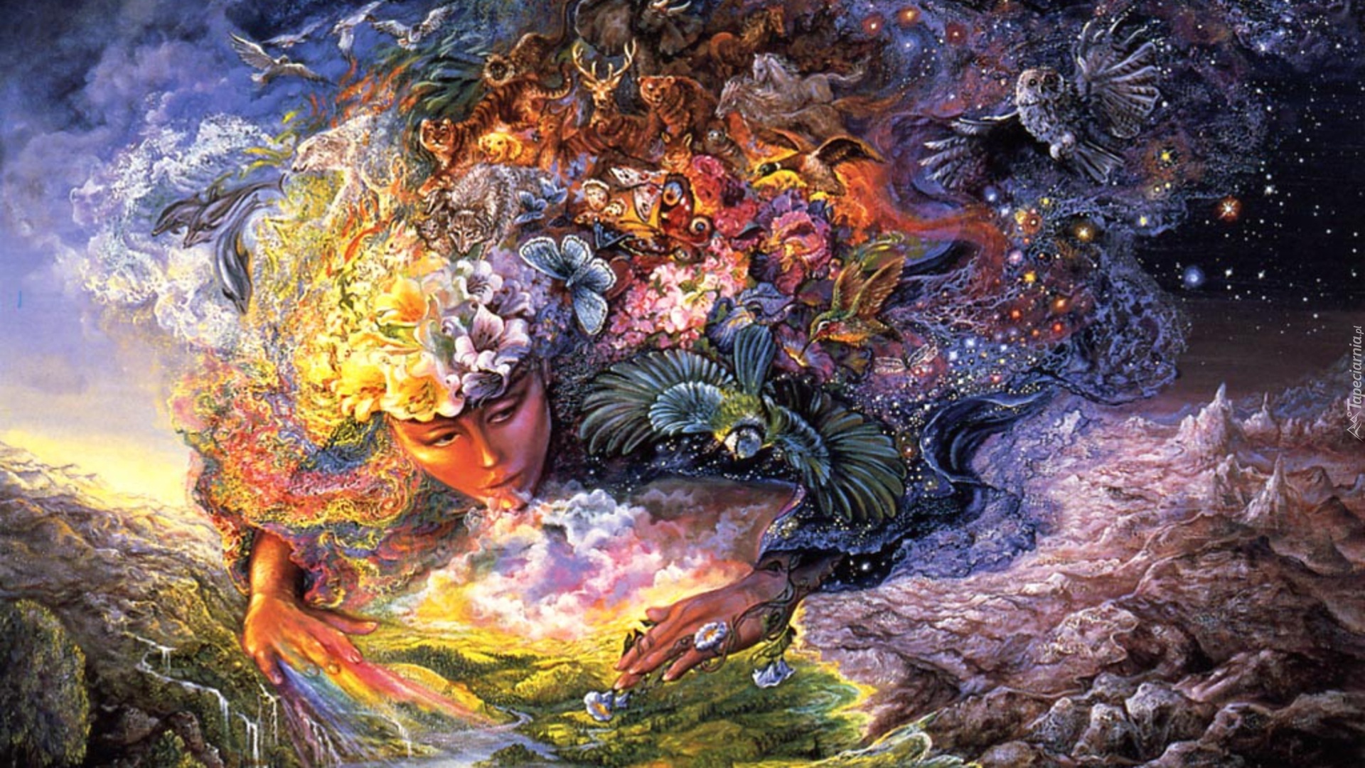 Edytor tapety: Dziewczyna, Wiatr, Kwiaty, Zwierzęta