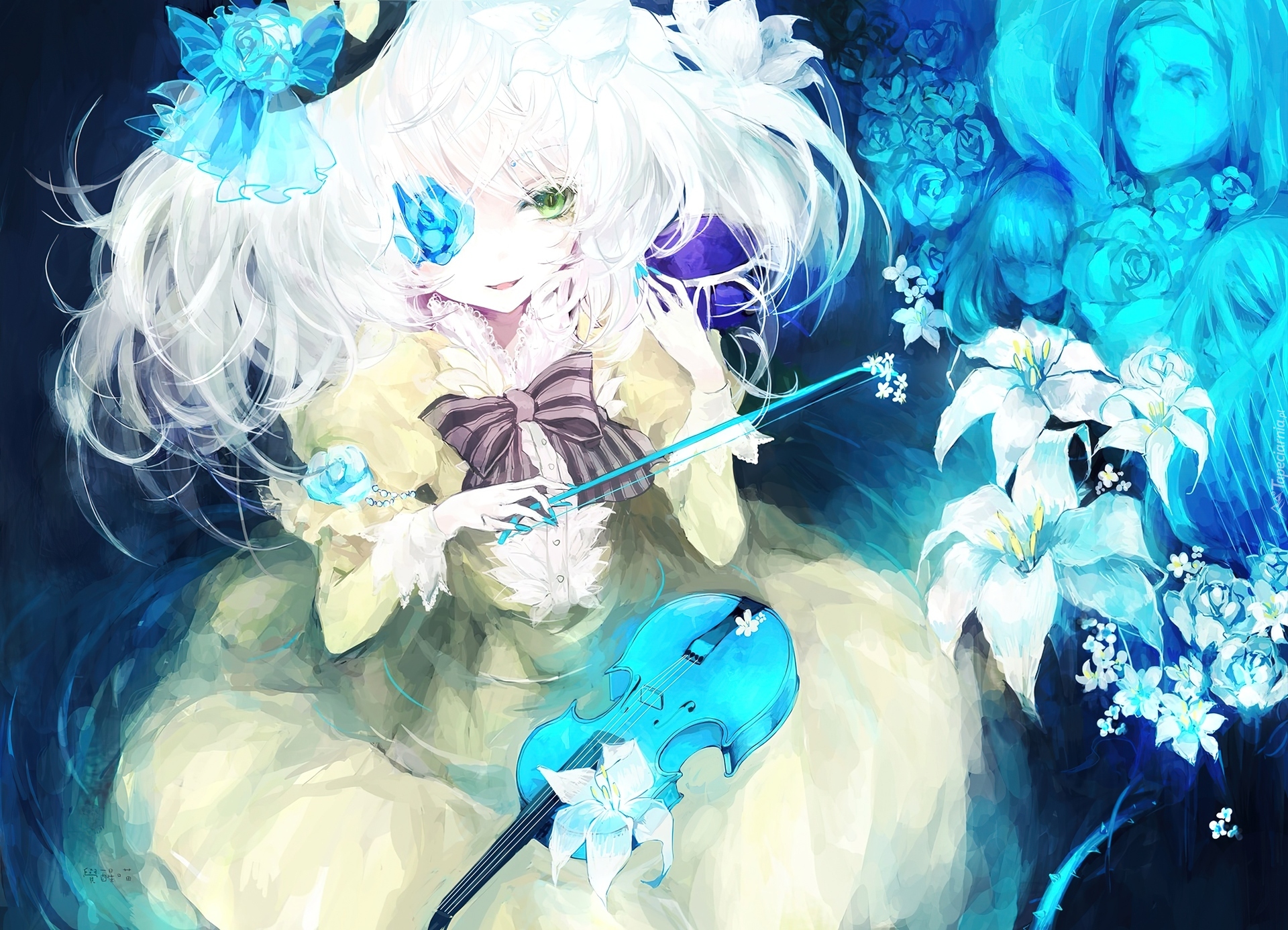 Edytor tapety: Dziewczyna, Skrzypce, Manga, Białe, Włosy, Kwiaty