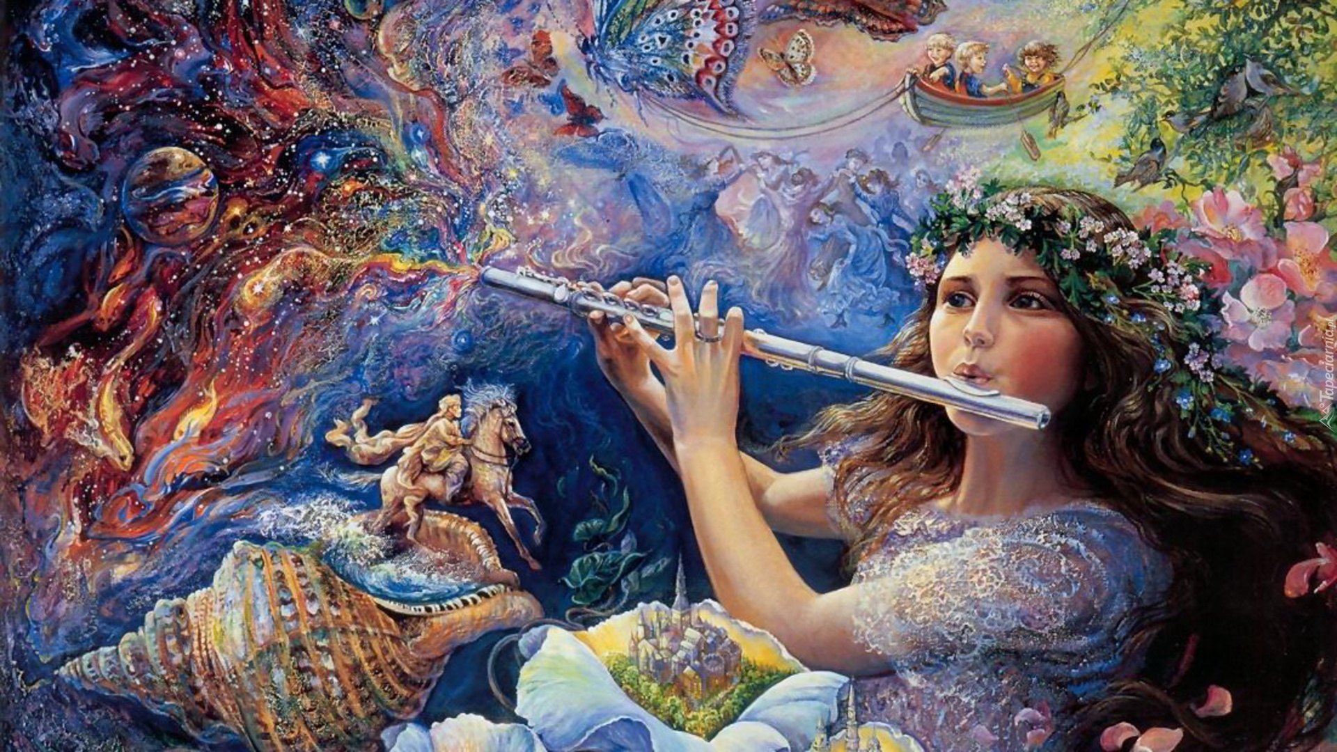 Edytor tapety: Dziewczyna, Flet, Muszla, Kwiaty