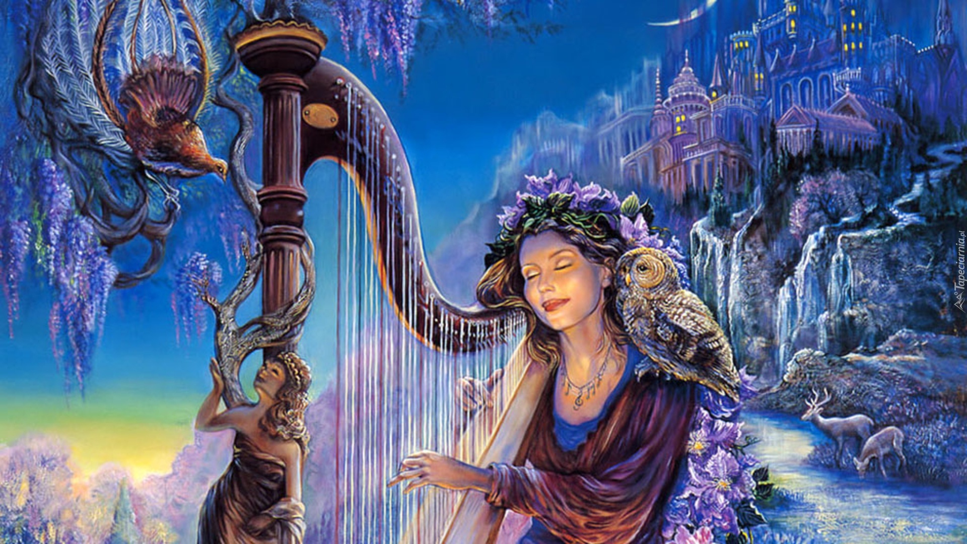 Edytor tapety: Kobieta, Harfa, Sowa, Góry, Zamek